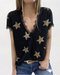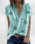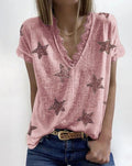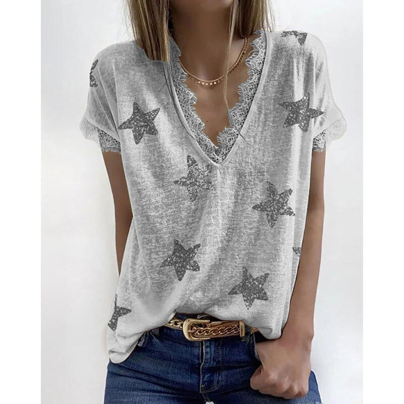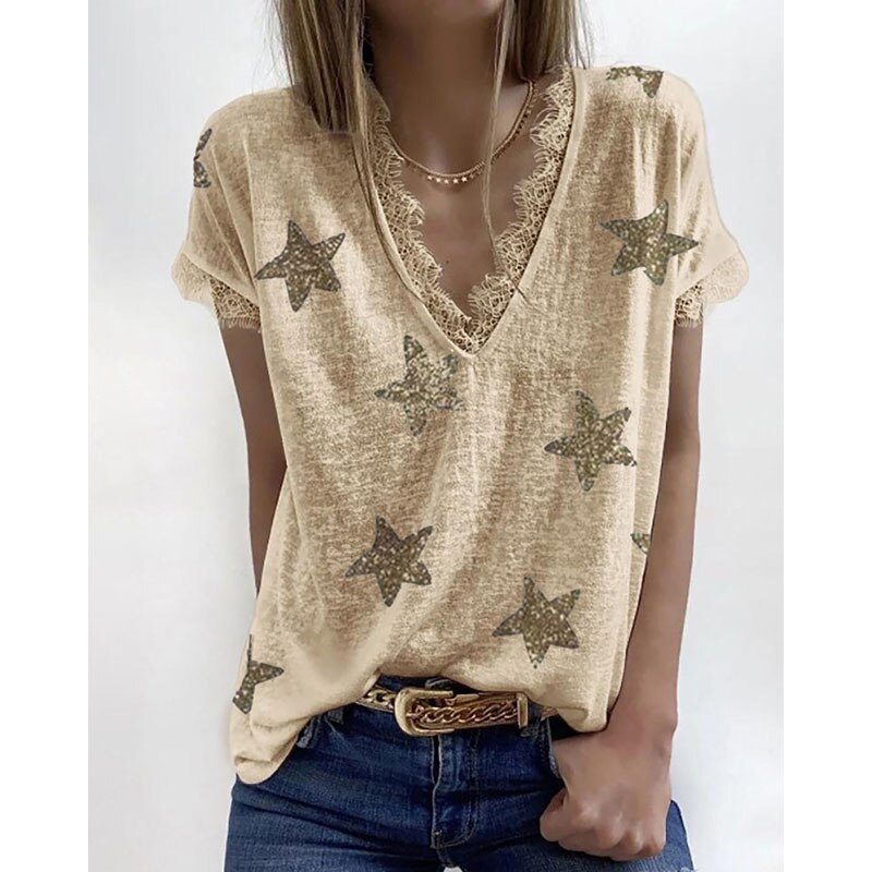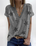 Deep V Neck Lace Patchwork Star Print Casual Loose Short Sleeve Ladies T-Shirts