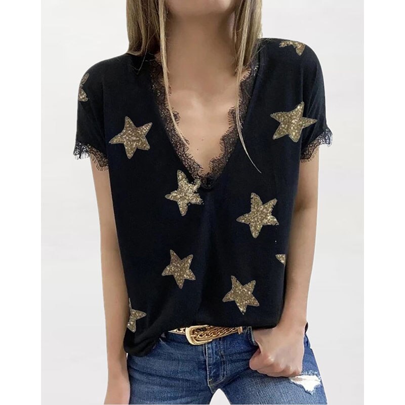 Sale Deep V Neck Lace Patchwork Star Print Casual Loose Short Sleeve Ladies T-Shirts