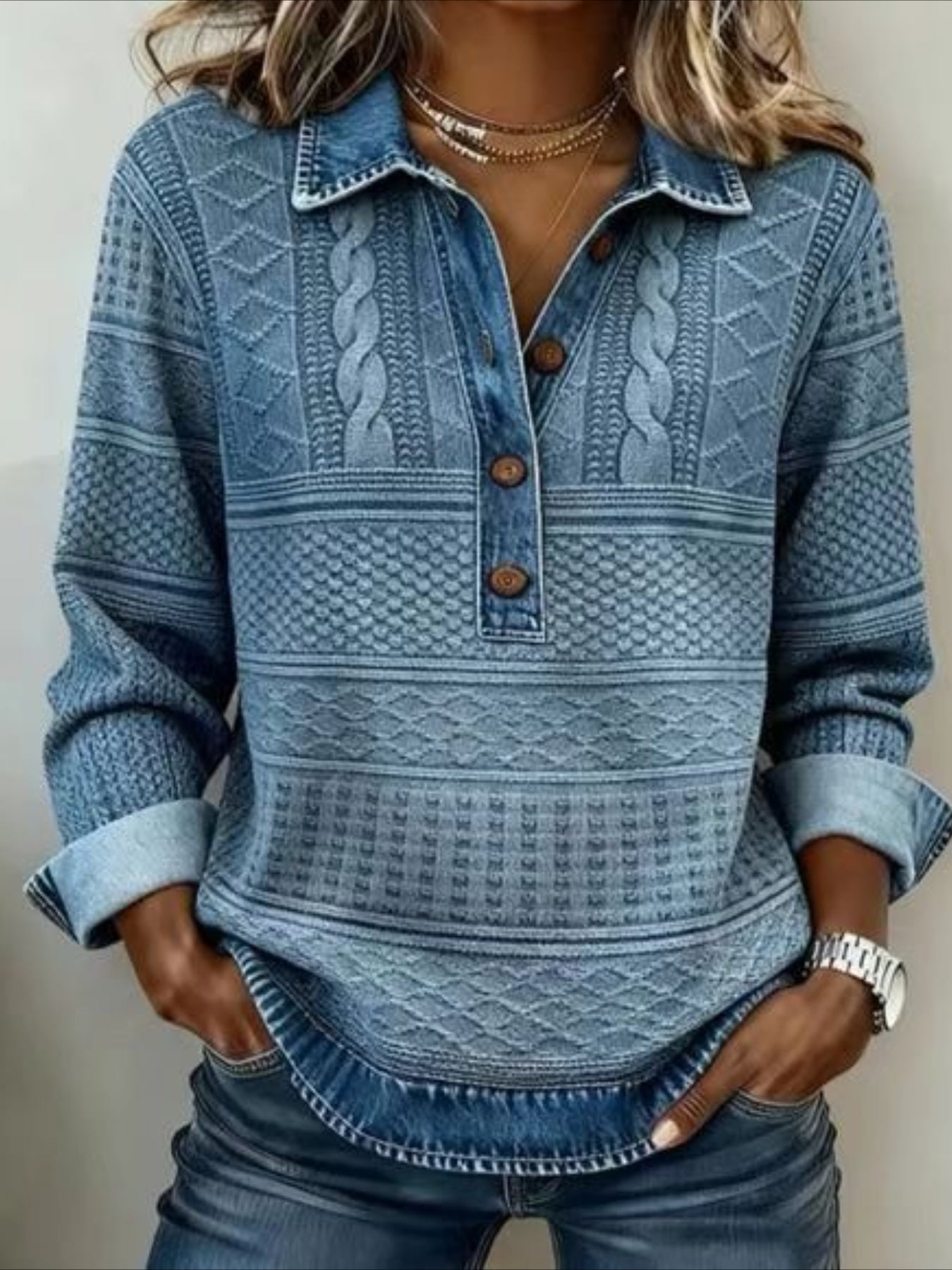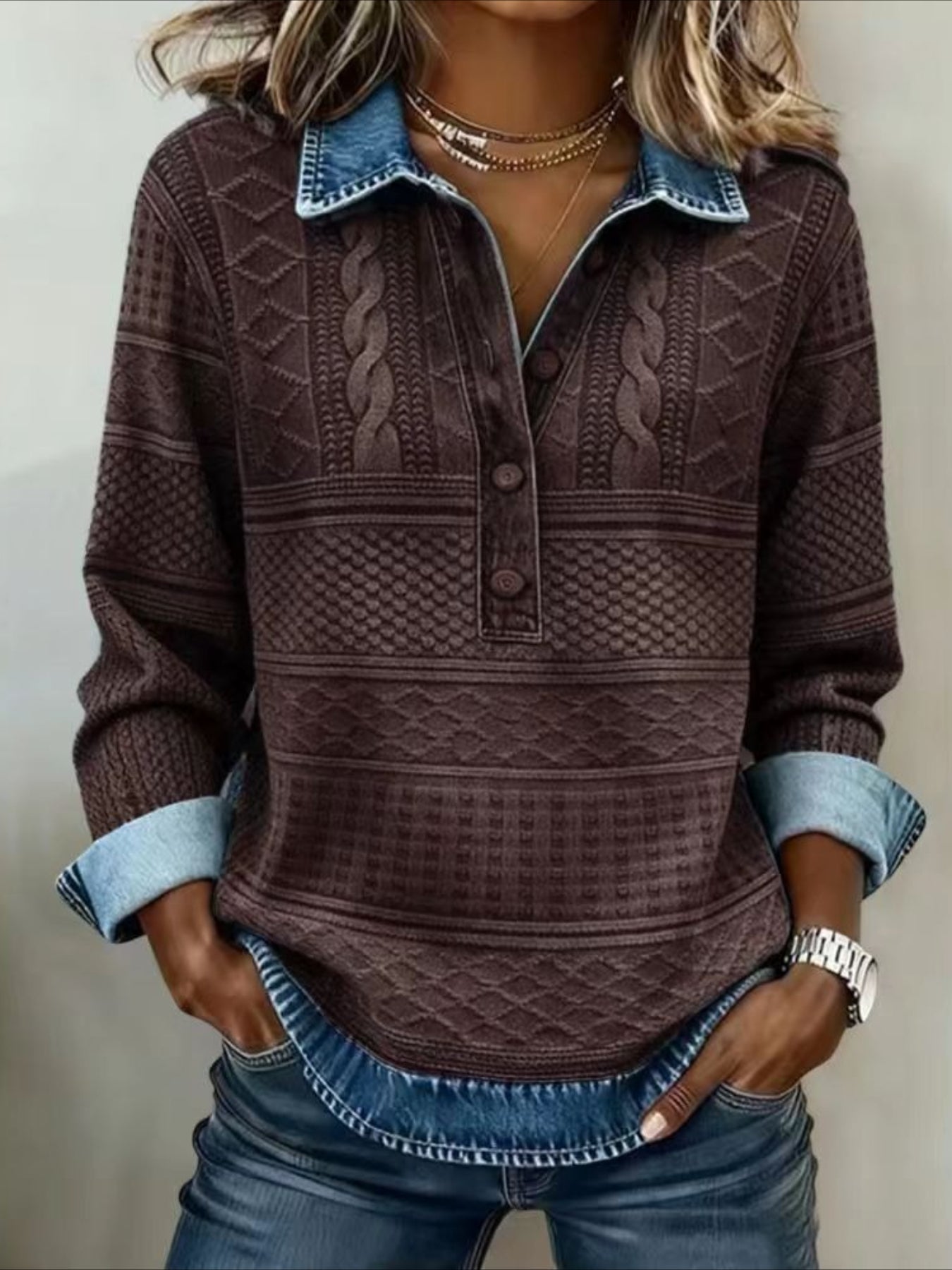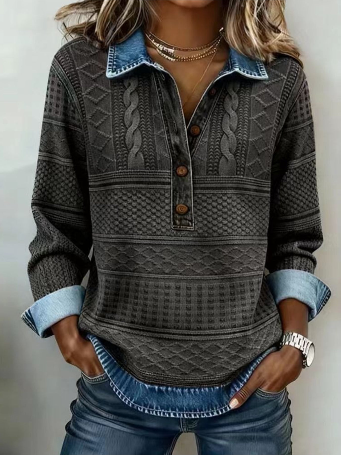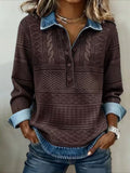 Denim Patchwork Print Casual Collared Long Sleeve Sweatshirt
