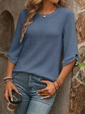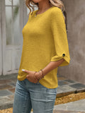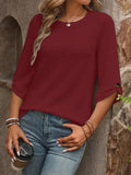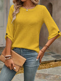 Elegant 3/4 Sleeve Loose Fit Round Neck Solid Color T-Shirt with Decorative Buttons