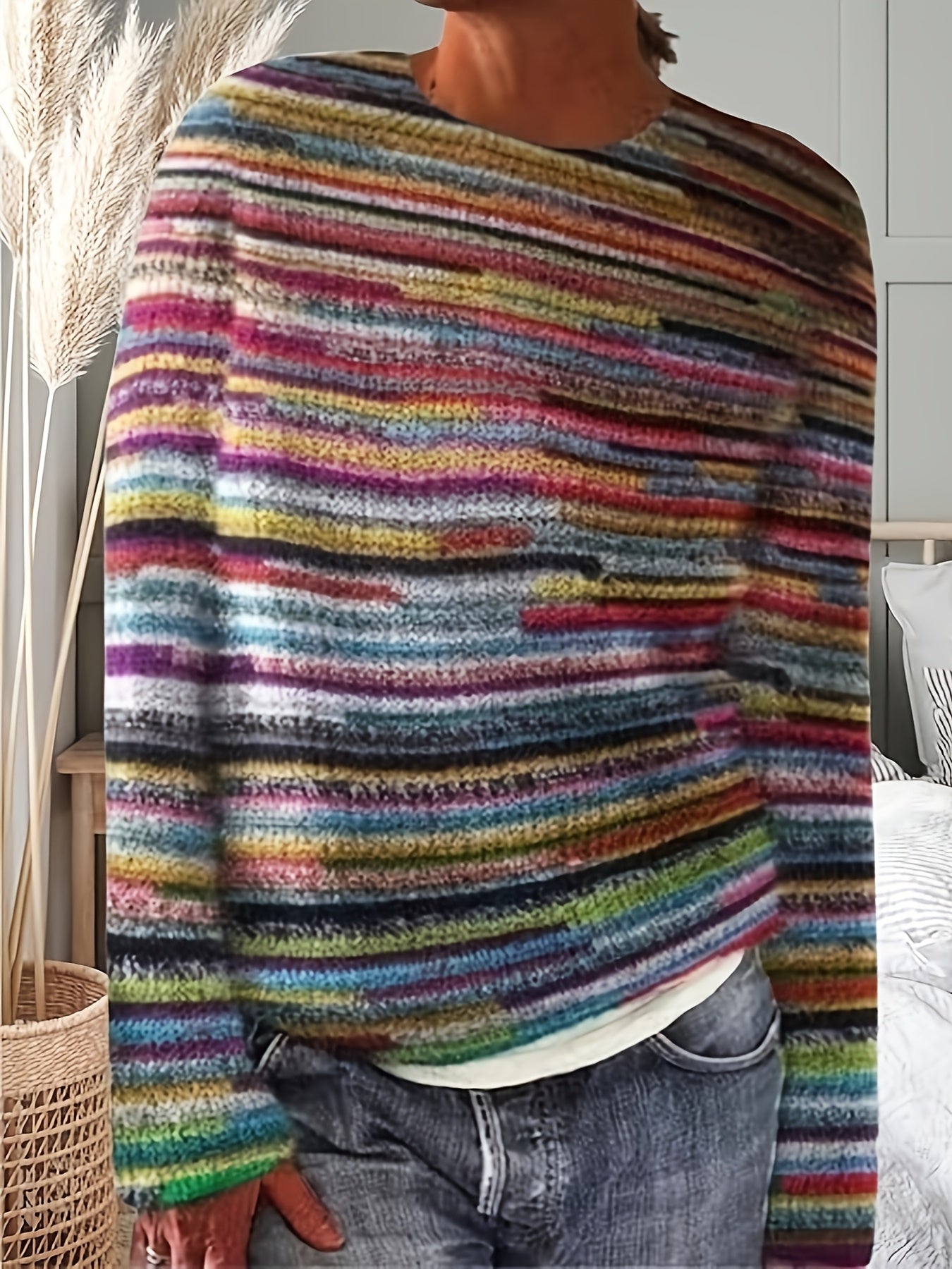Elegant Color-Block Round Neck Long Sleeve Pullover Sweater