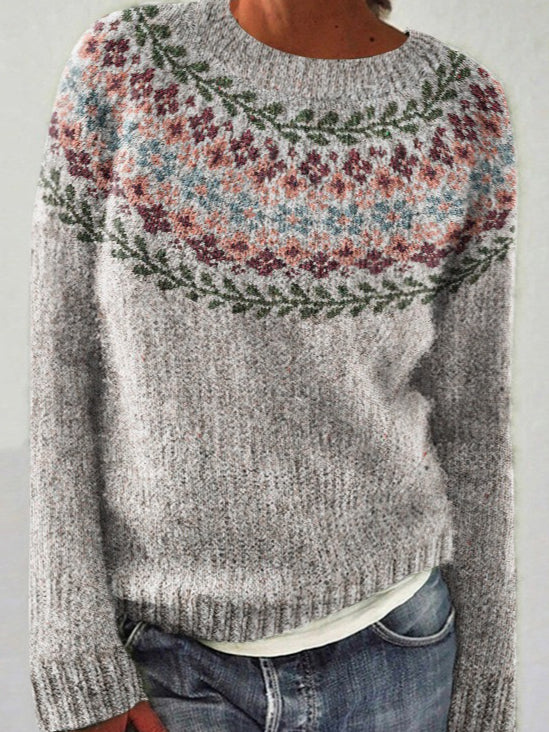 Sale Cozy Chic Knit Crew Neck Long Sleeve Pullover with Ethnic Pattern Sweater