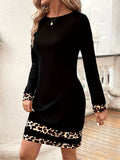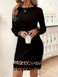 Elegant Leopard Print Panel Long Sleeve Dress - Crew Neck, Stretchy Polyester Blend