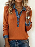 Denim Printing Polo Collar Button-down Knitted Cardigan Sweater