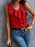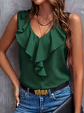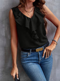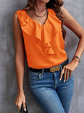 Elegant Ruffled Solid Color V-Neck Sleeveless Blouse