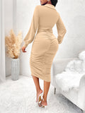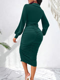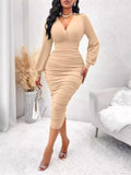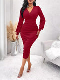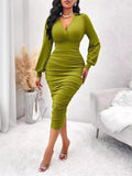 Elegant Side Ruched Long Sleeve Solid Color V-Neck Midi Dress
