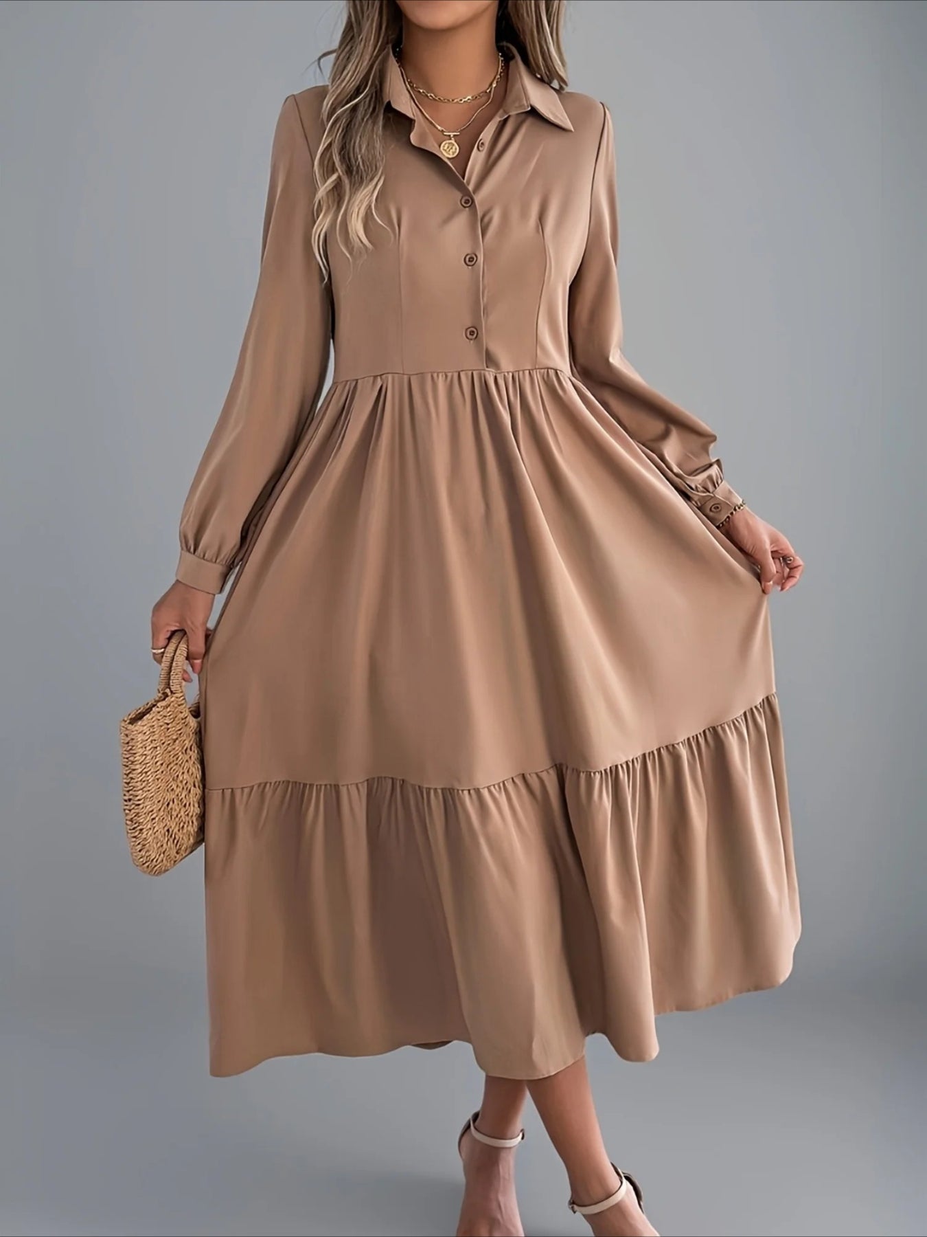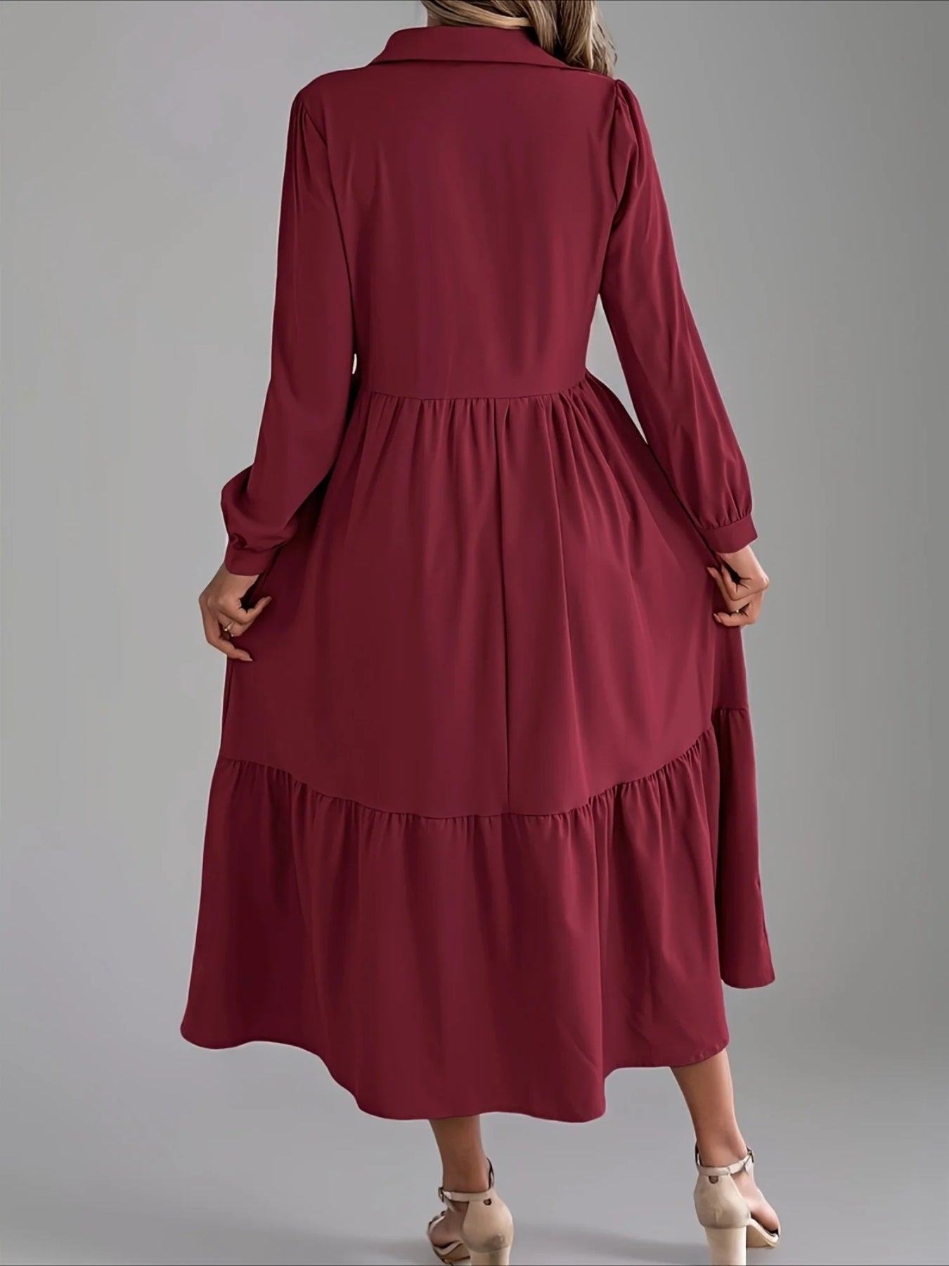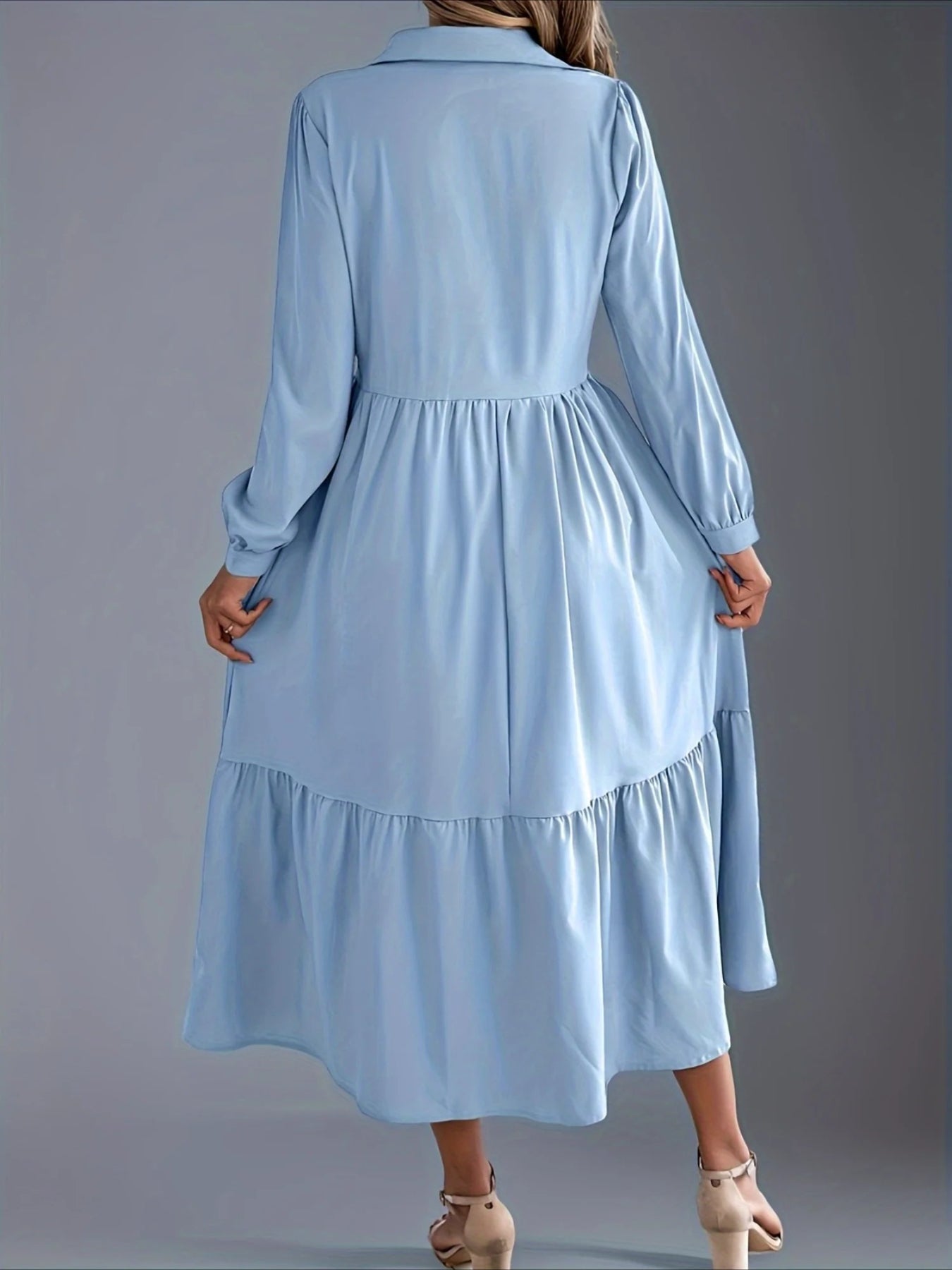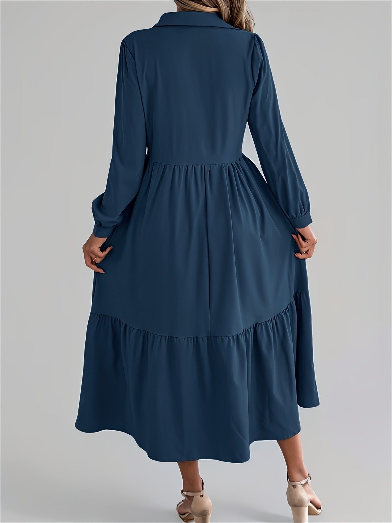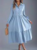Elegant Solid Color Ruffle Hem Long Sleeve Lapel Collar Midi Dress
