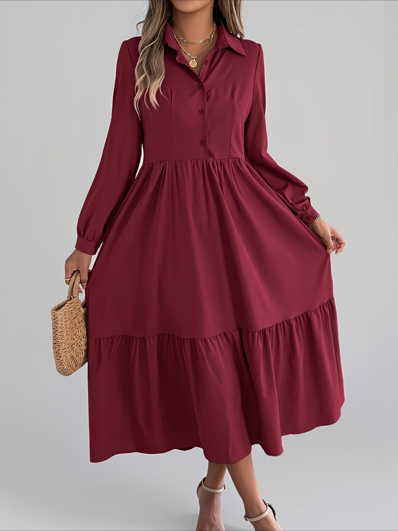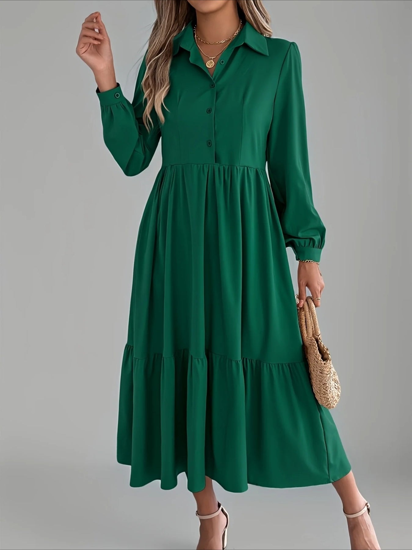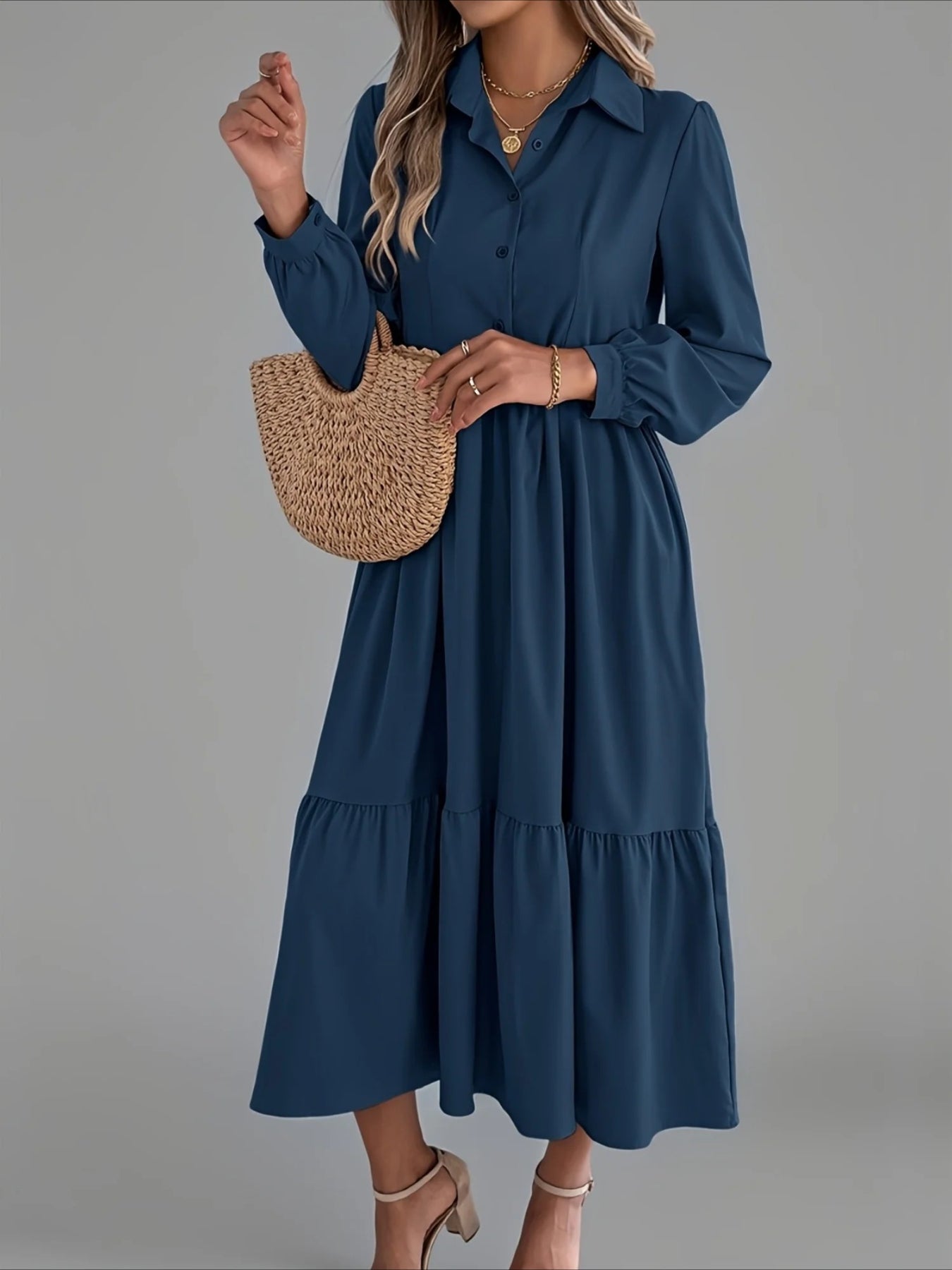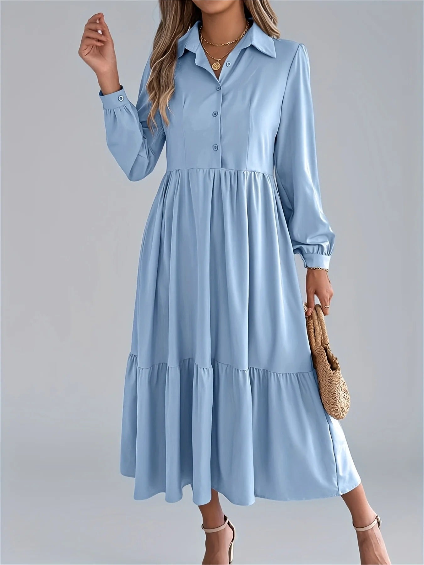 Elegant Solid Color Ruffle Hem Long Sleeve Lapel Collar Midi Dress