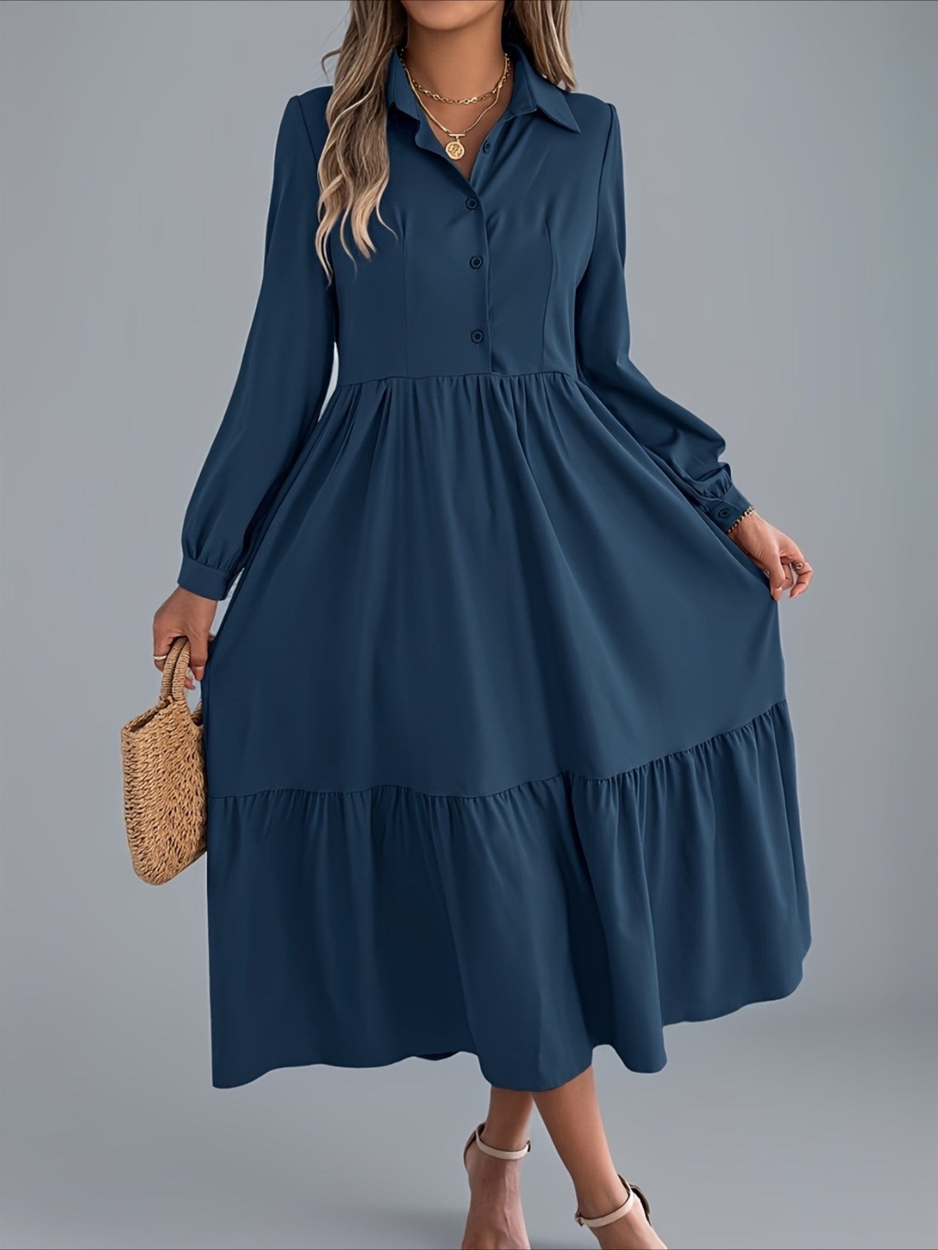 Sale Solid Color Single Breasted Simple Dress, Elegant Long Sleeve Maxi Loose Dress