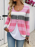 Sale Striped Botton Crew Neck T-Shirt, Elegant Long Sleeve T-Shirt