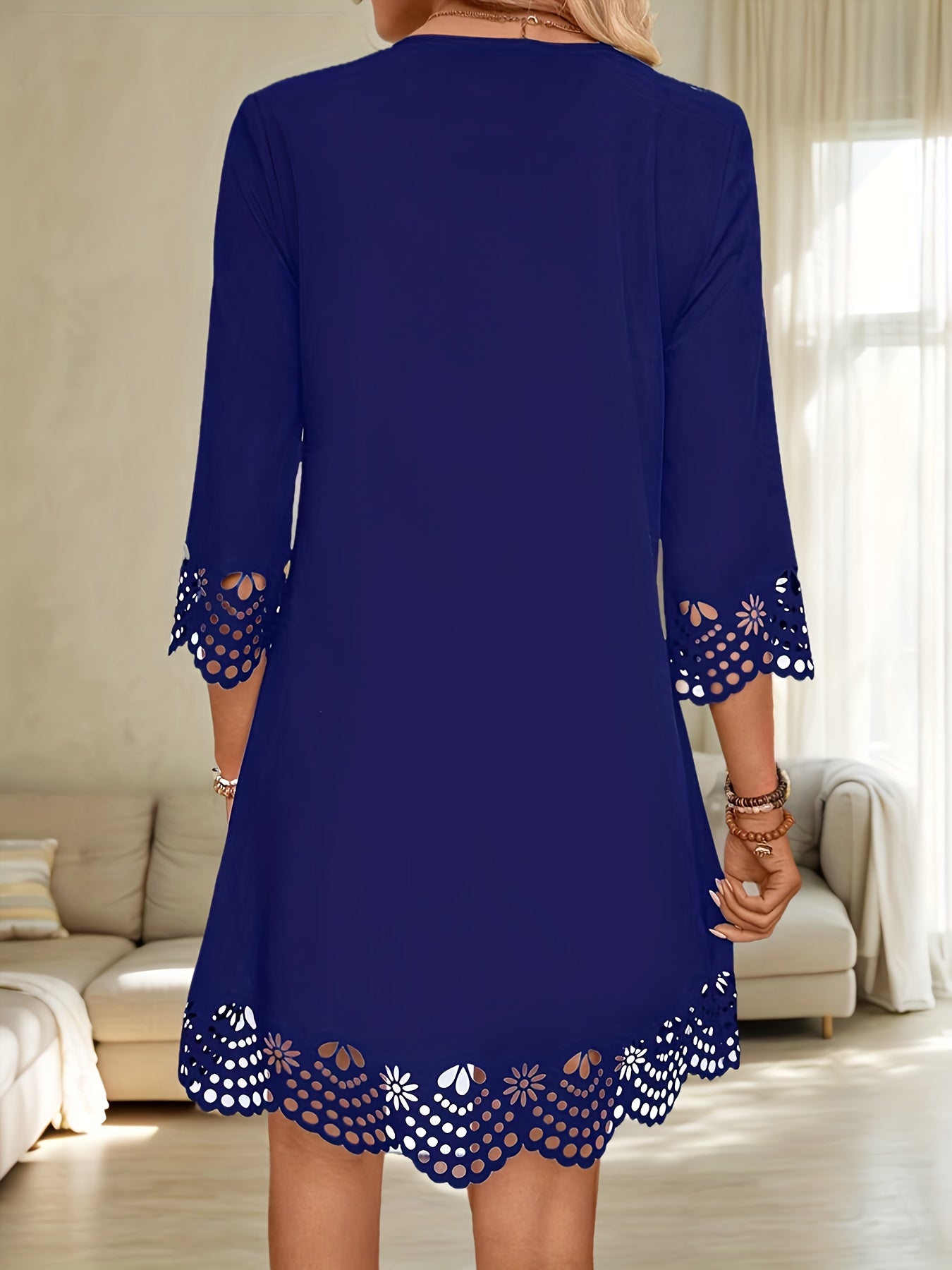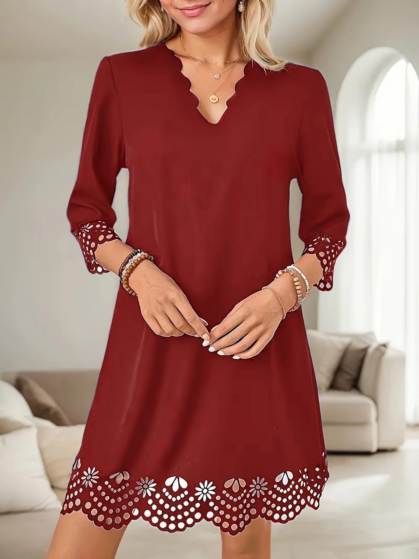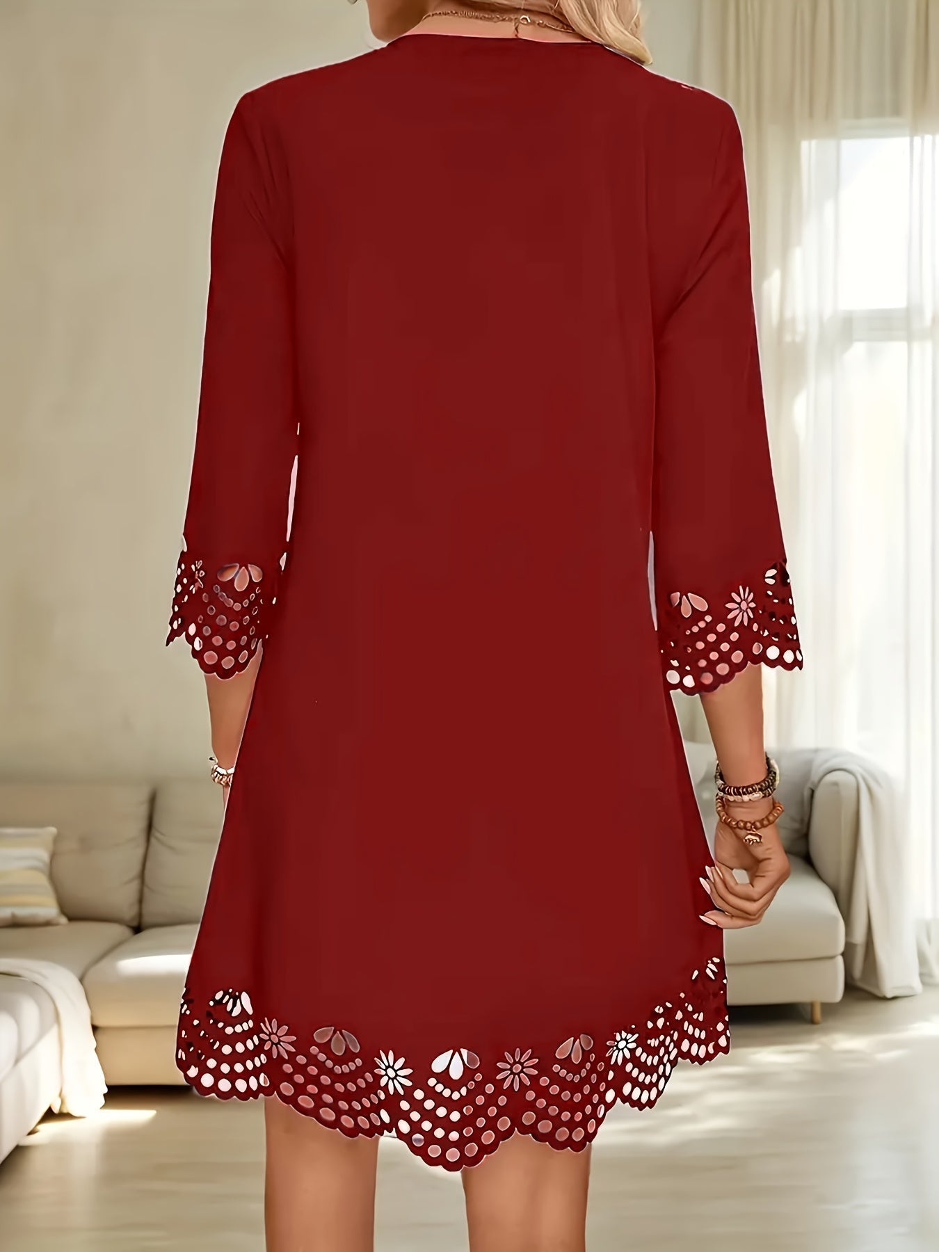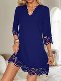 Sale Three-quarter Illusion Sleeve Floral Dress, Casual Keyhole Crew Neck Loose Dress