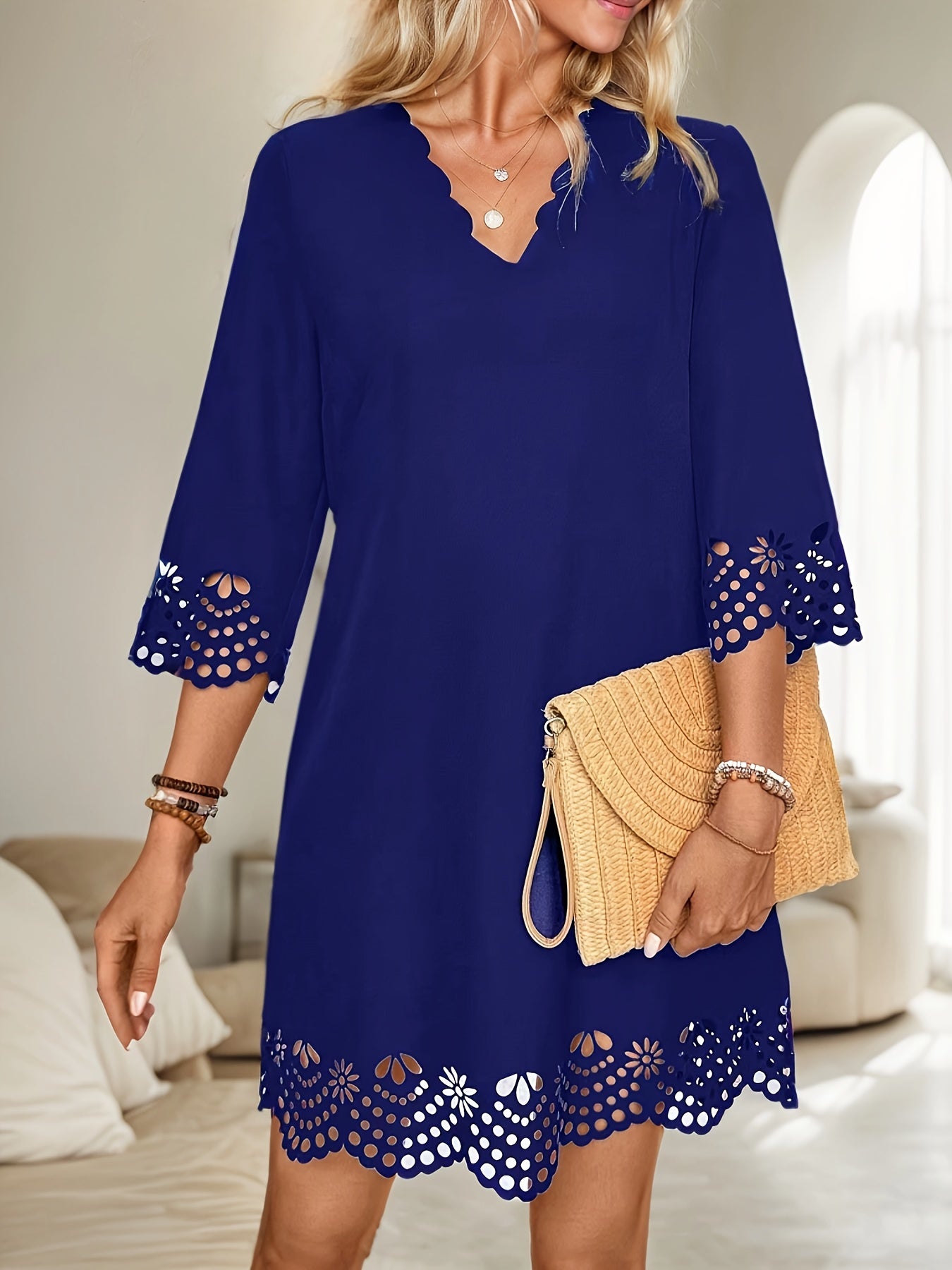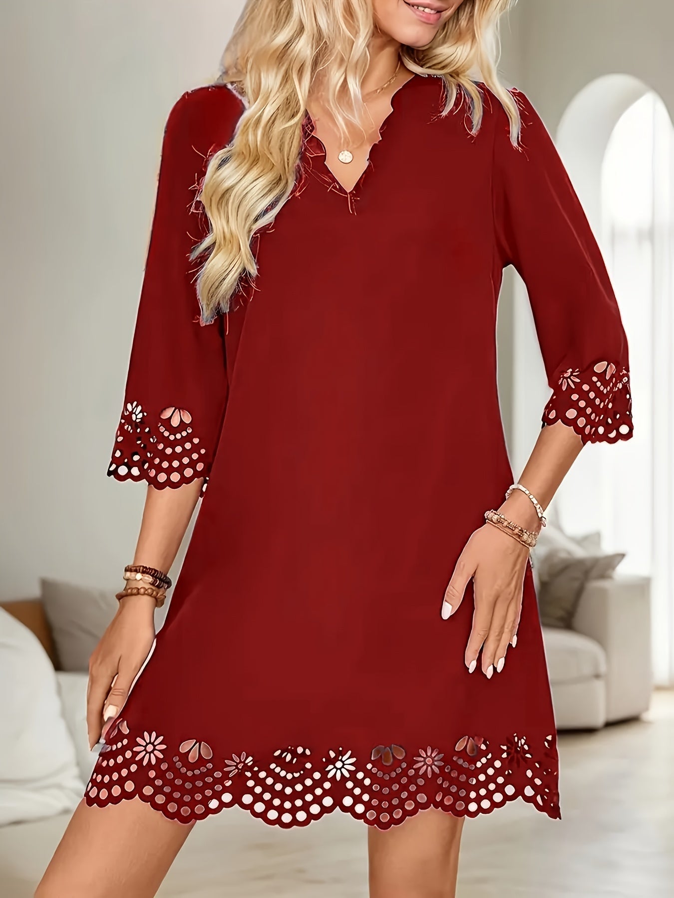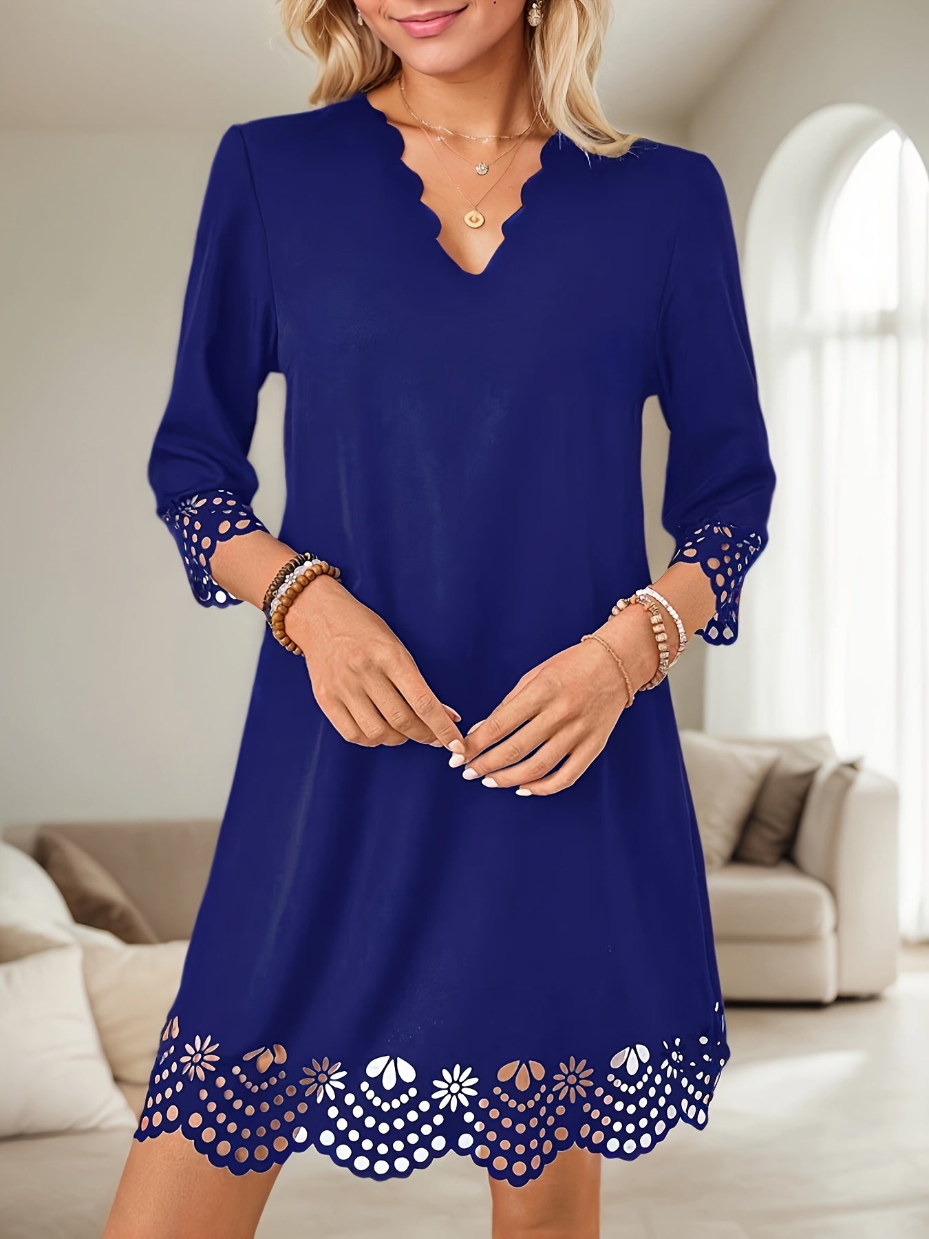 Sale Three-quarter Illusion Sleeve Floral Dress, Casual Keyhole Crew Neck Loose Dress