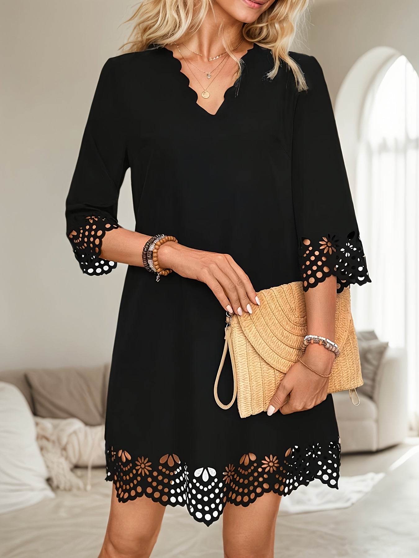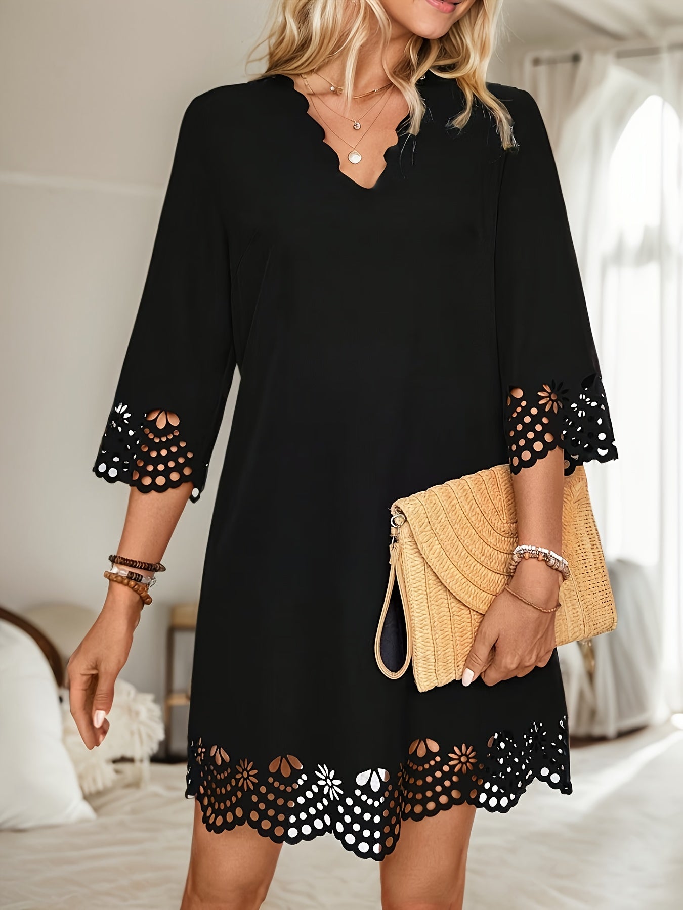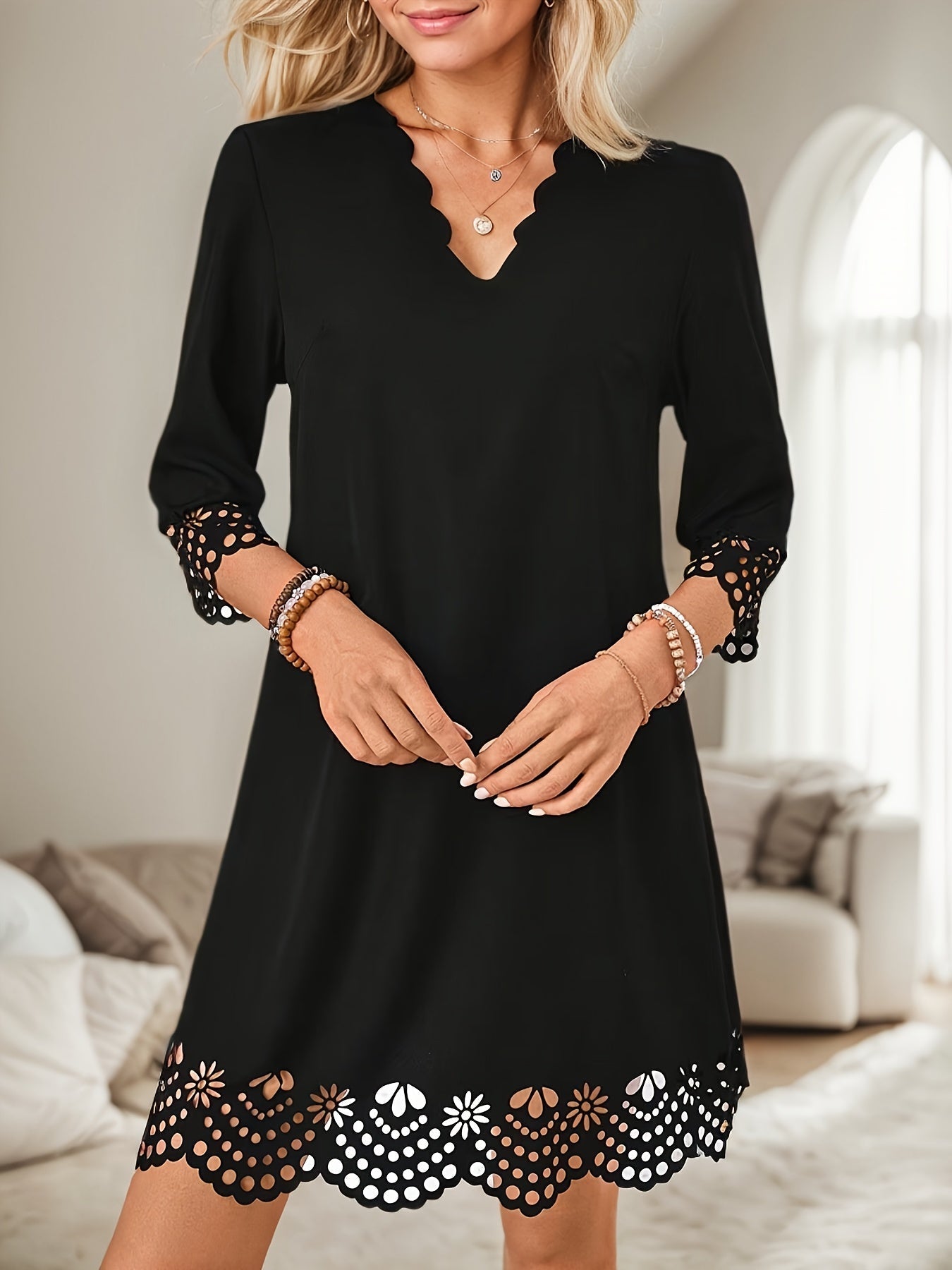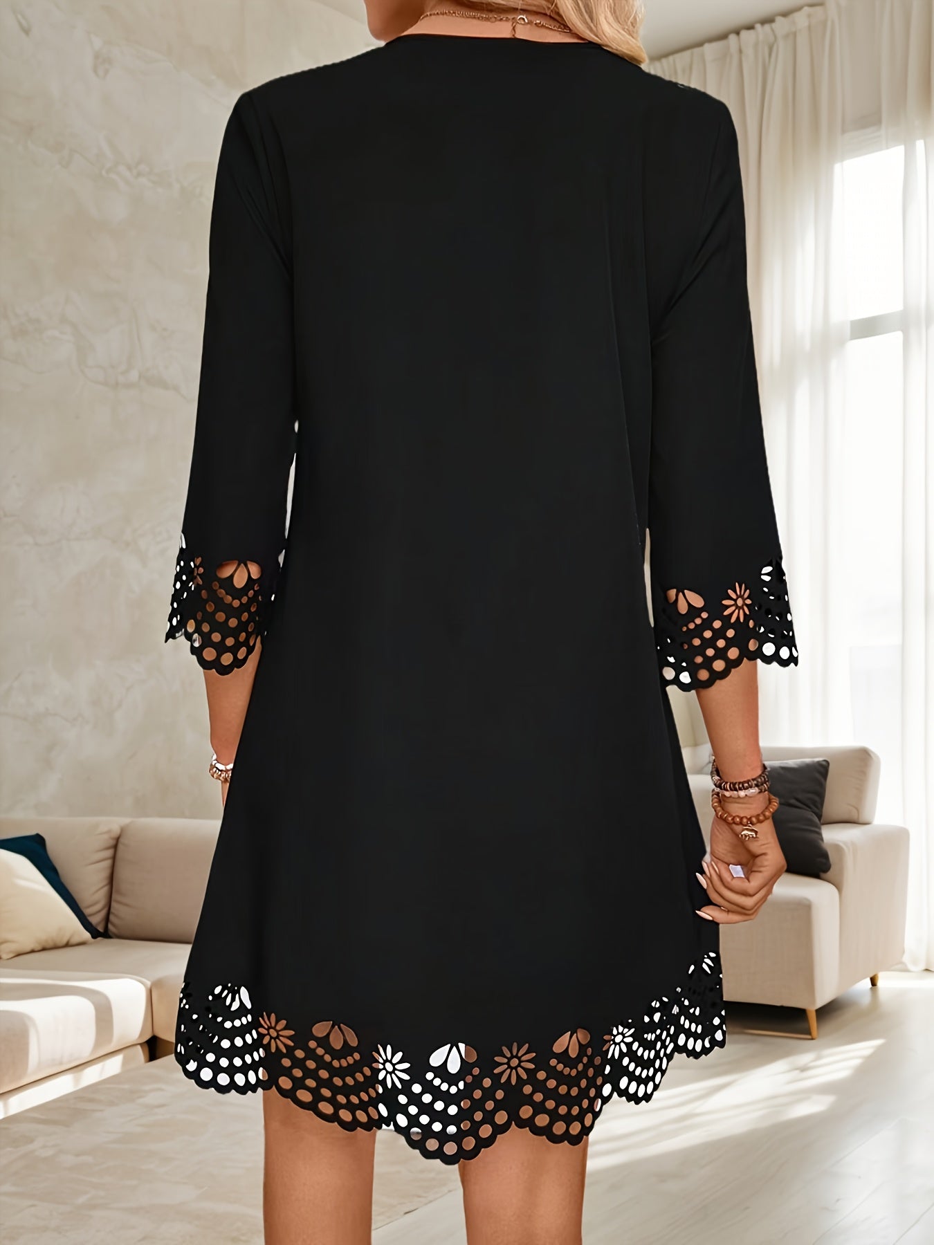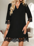 Sale Black Contrast Stitched V Neck 3/4 Sleeve Tiered Mini Dress