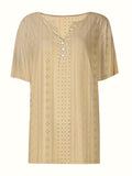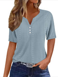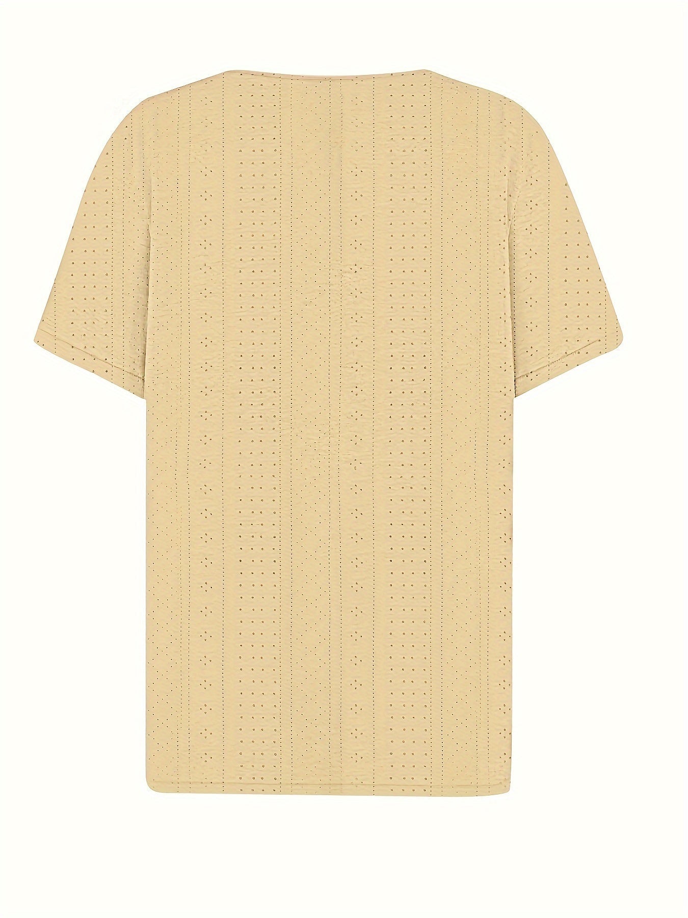 Eyelet Embroidered Button Front T-shirt, Casual V Neck Short Sleeve Top