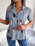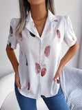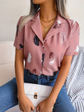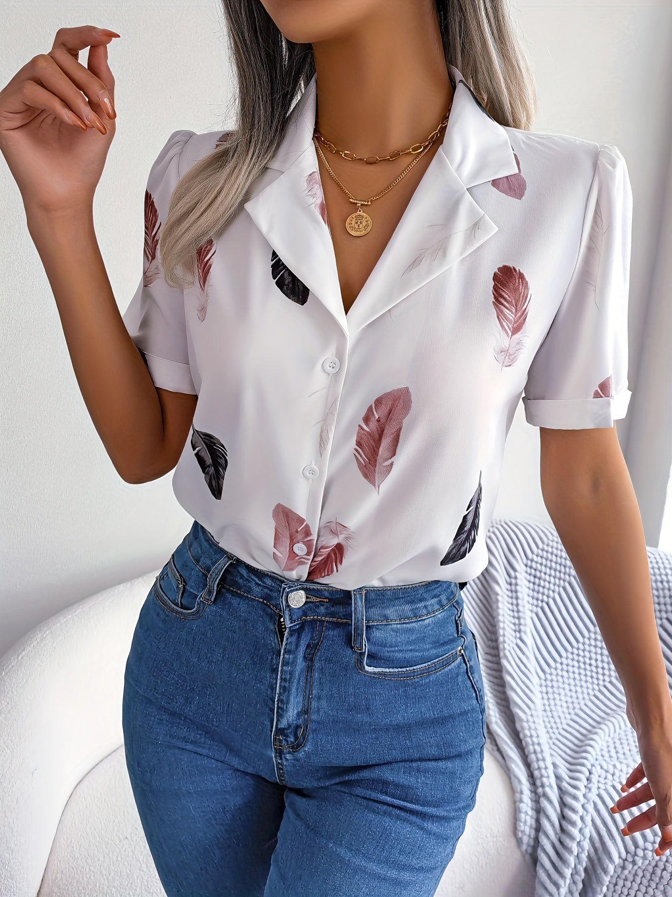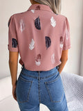 Feather Print Button Front Shirt, Casual Lapel Short Sleeve Shirt