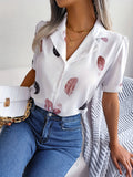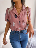 Sale Feather Print Button Front Shirt, Casual Lapel Short Sleeve Shirt