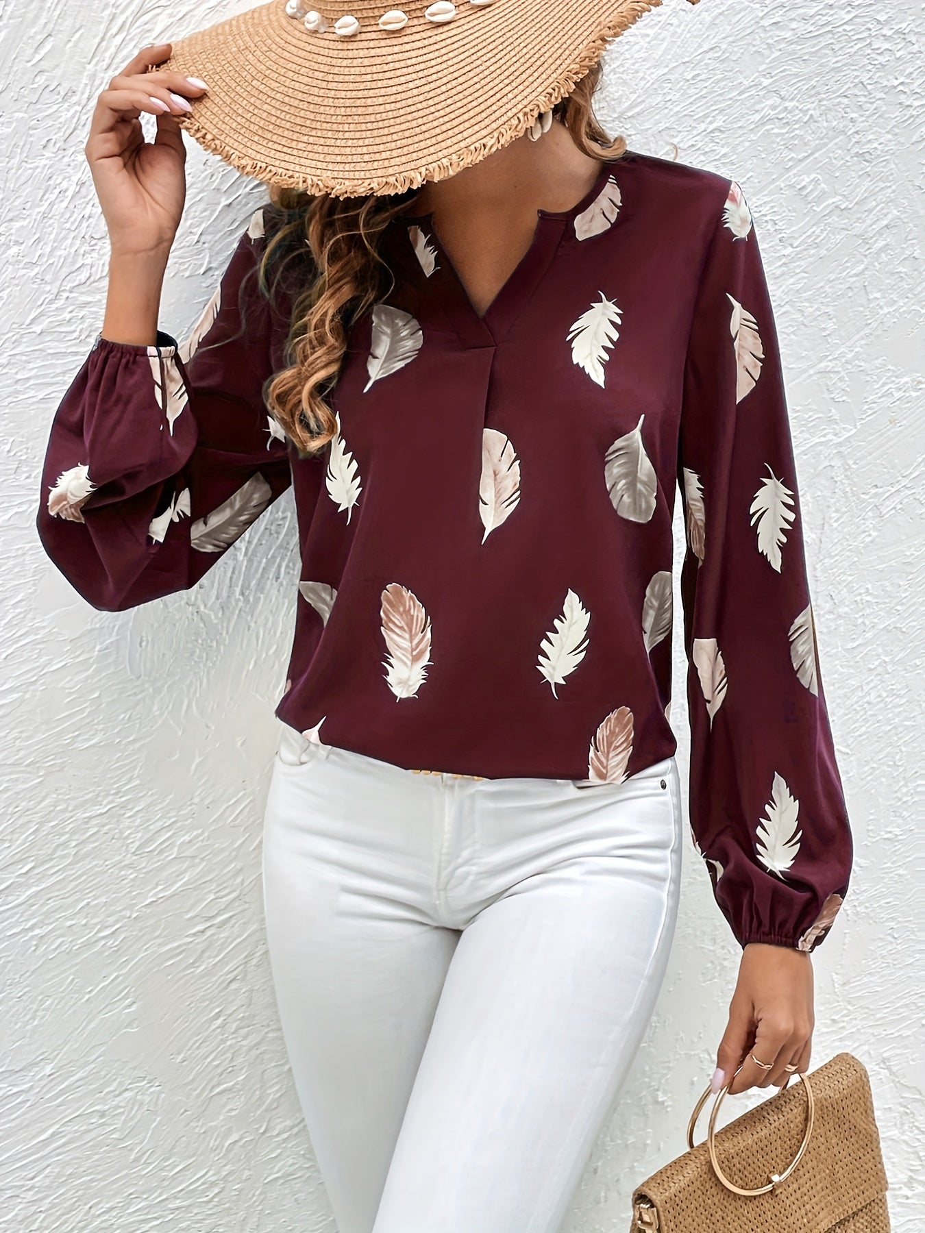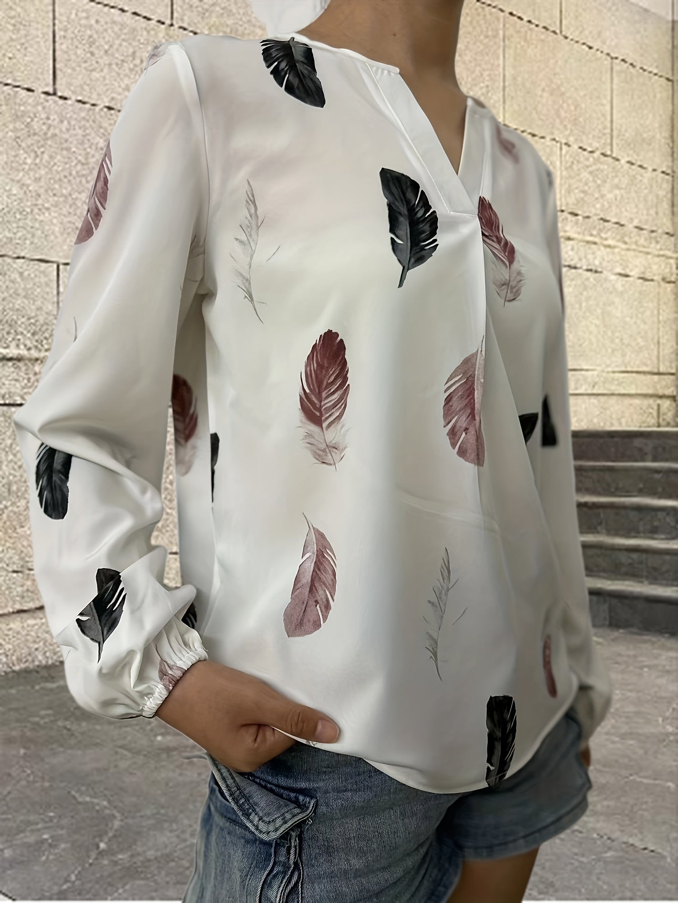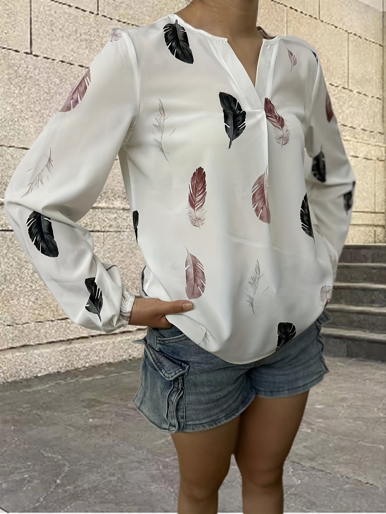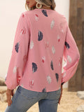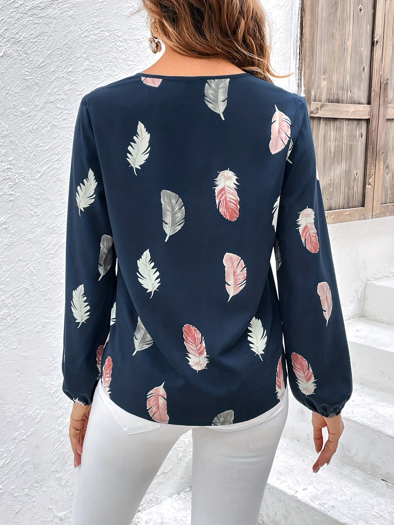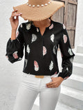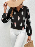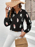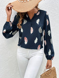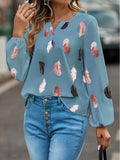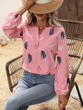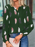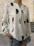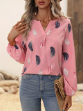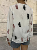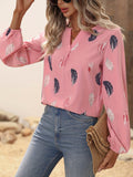 Feather Printed V-neck Loose Shirts, Casual Long Sleeve Fashion Shirts