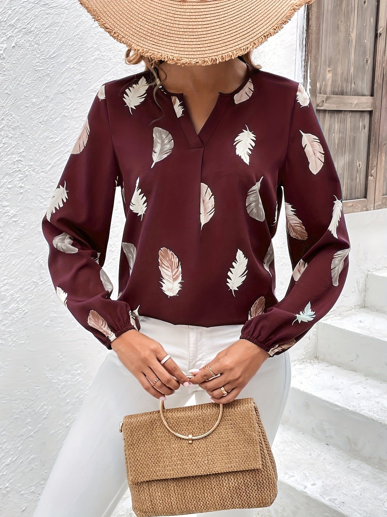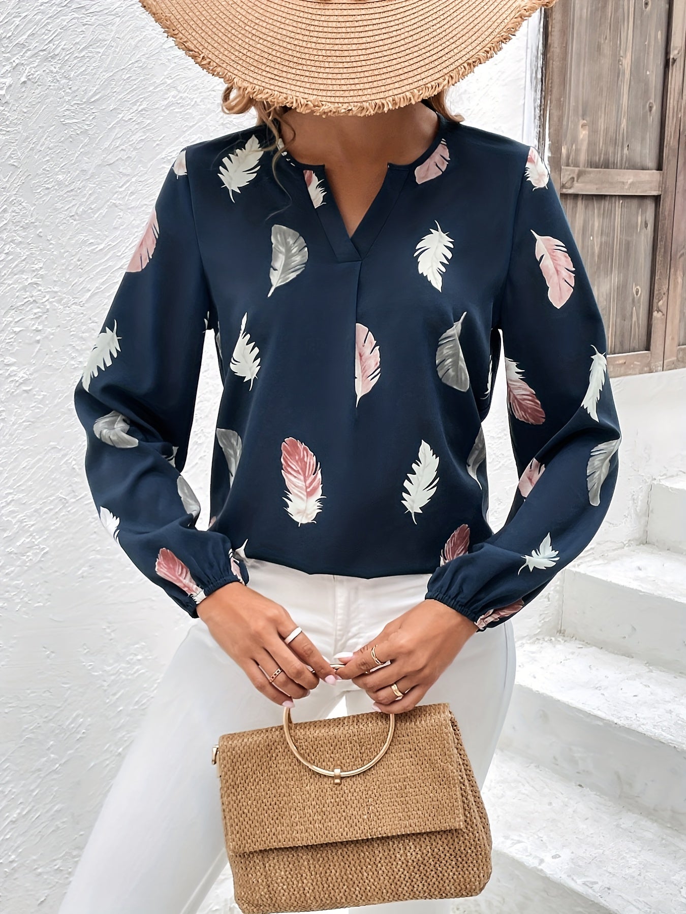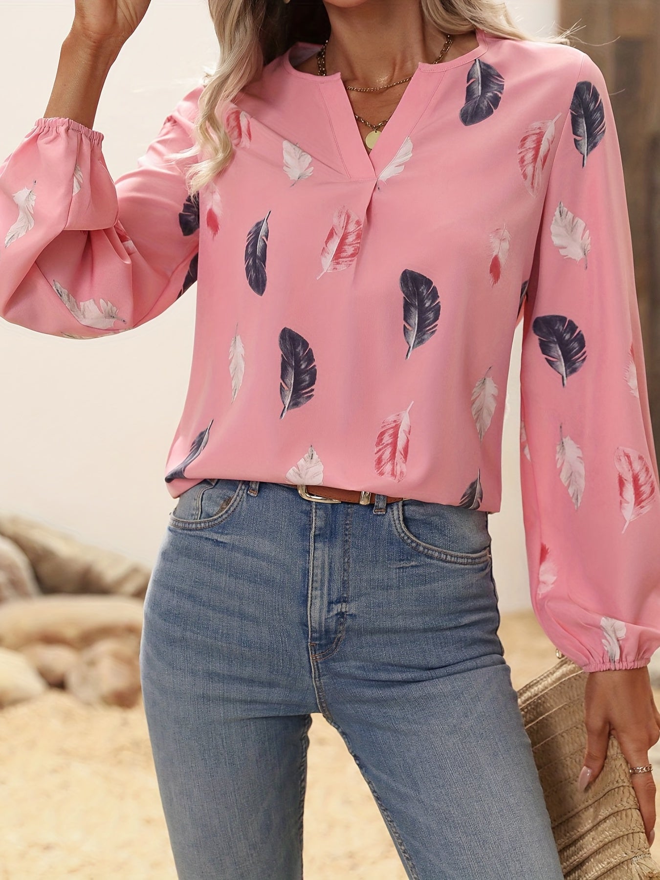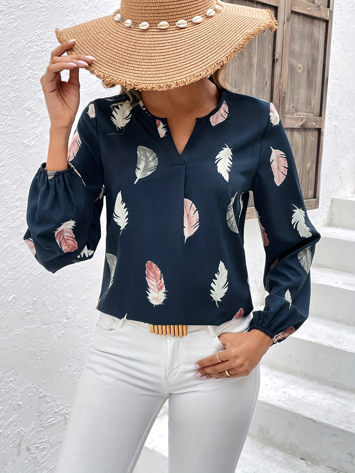Feather Printed V-neck Loose Shirts, Casual Long Sleeve Fashion Shirts