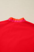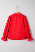 Fiery Red Striped Trim Ruffle Split Neck Long Sleeve Blouse