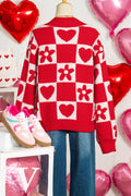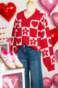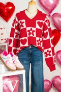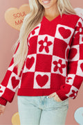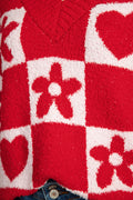 Fiery Red V Neck Flower Heart Detail Checkered Knit Loose Sweater