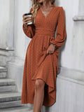 Elegant Solid Color Ruffle Hem Long Sleeve Lapel Collar Midi Dress