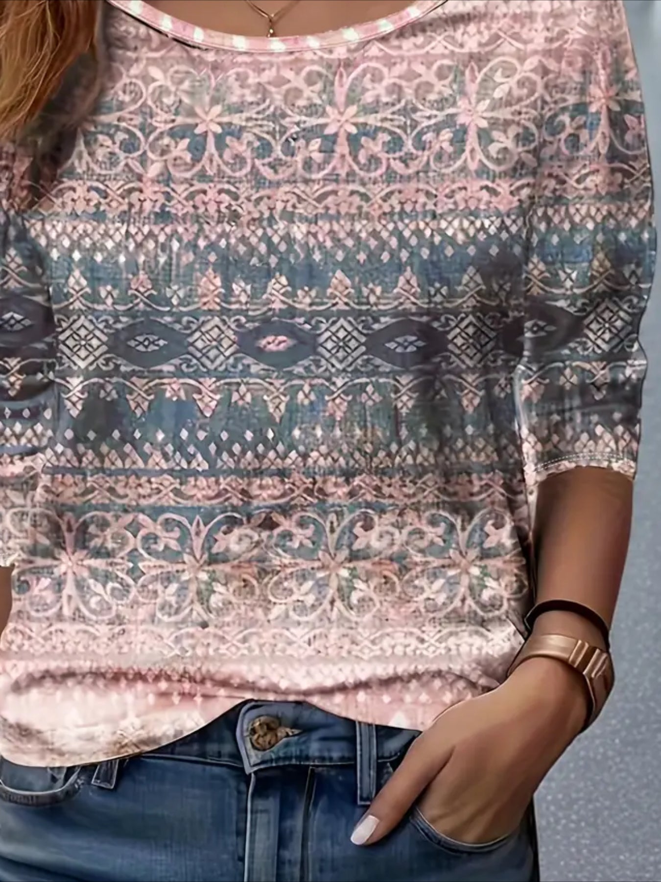 Sale Cozy Chic Knit Crew Neck Long Sleeve Pullover with Ethnic Pattern Sweater