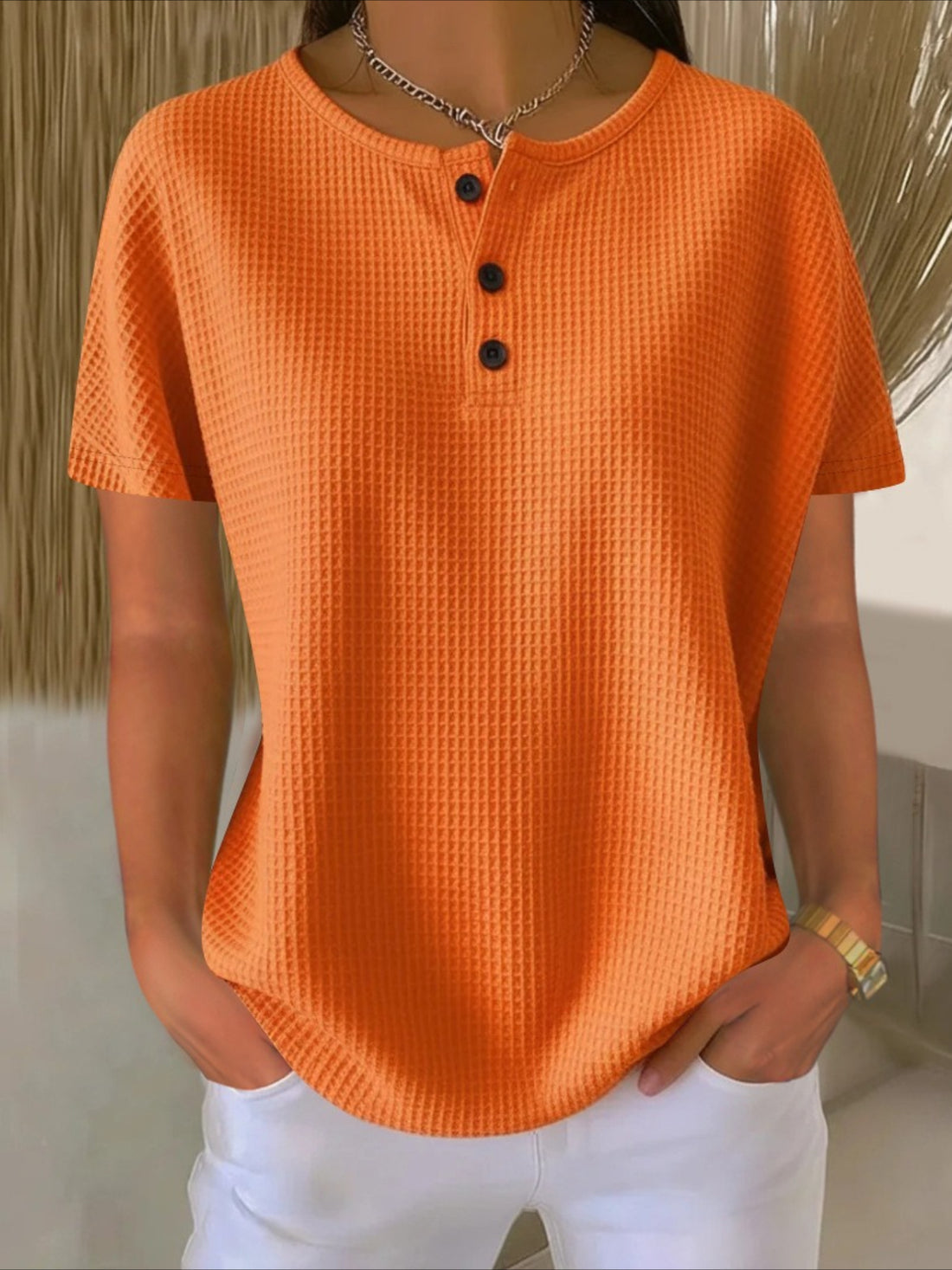 Waffle Texture Zipper Short Sleeve Round Neck T-Shirt