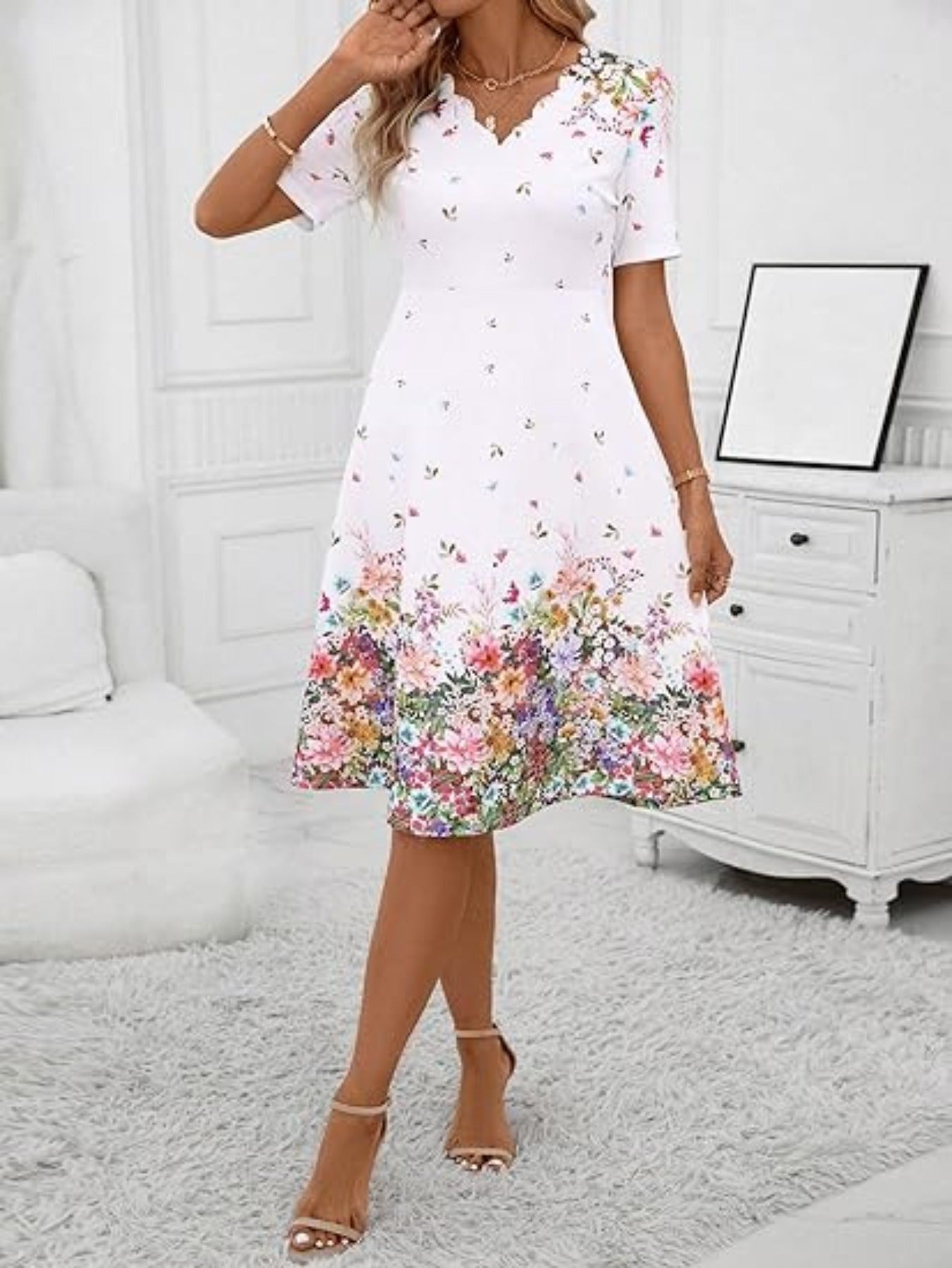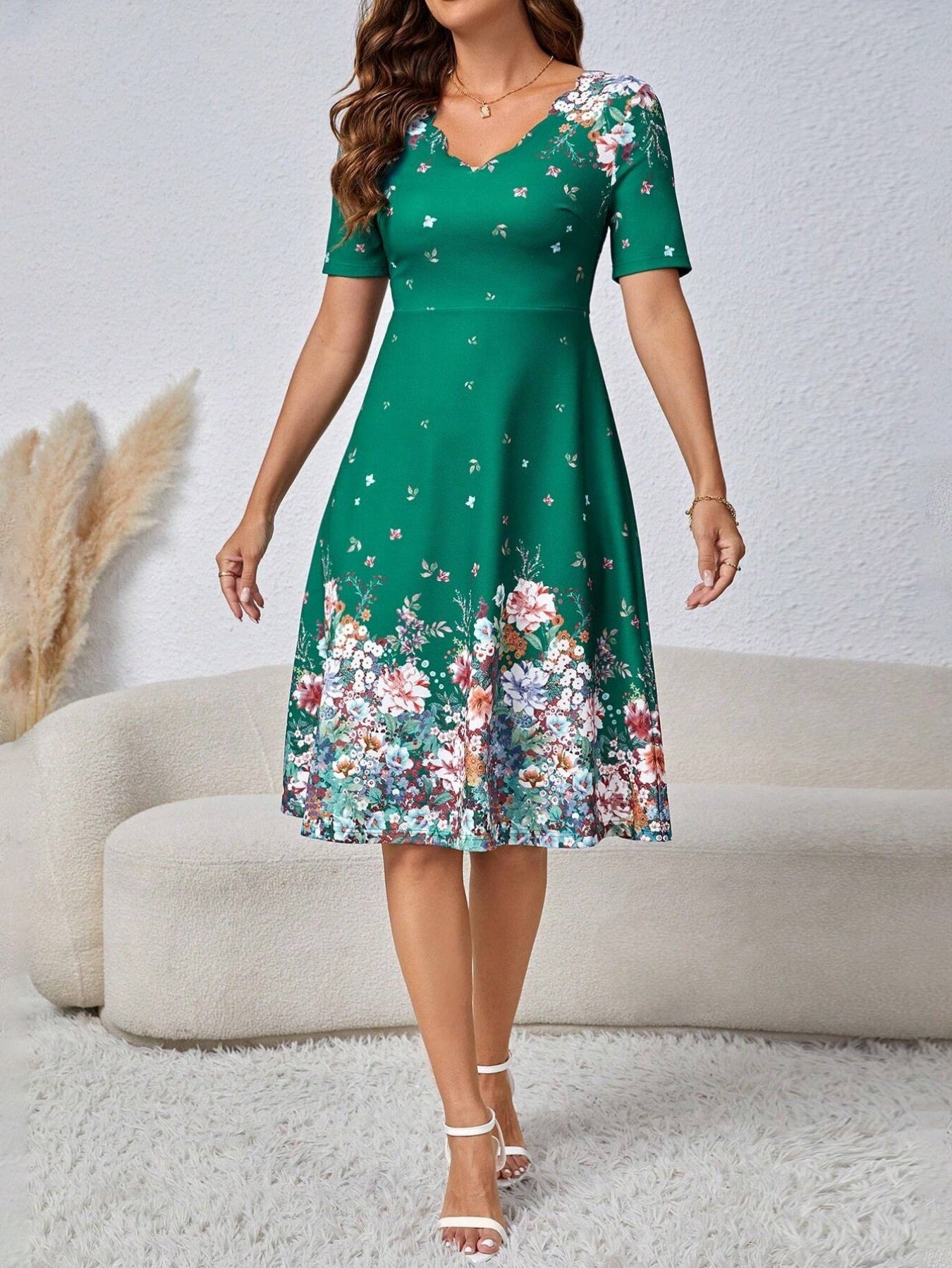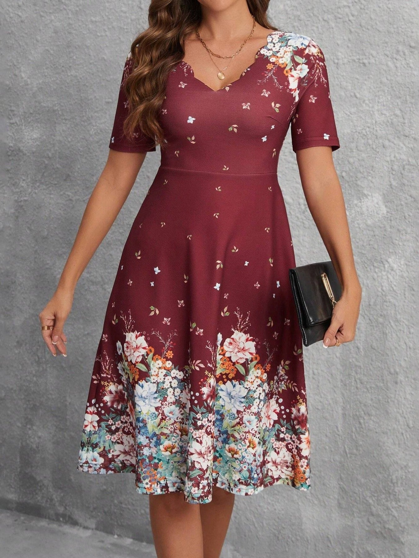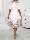 Floral Print V Neck Dress, Elegant Short Sleeve Flared Midi Dress