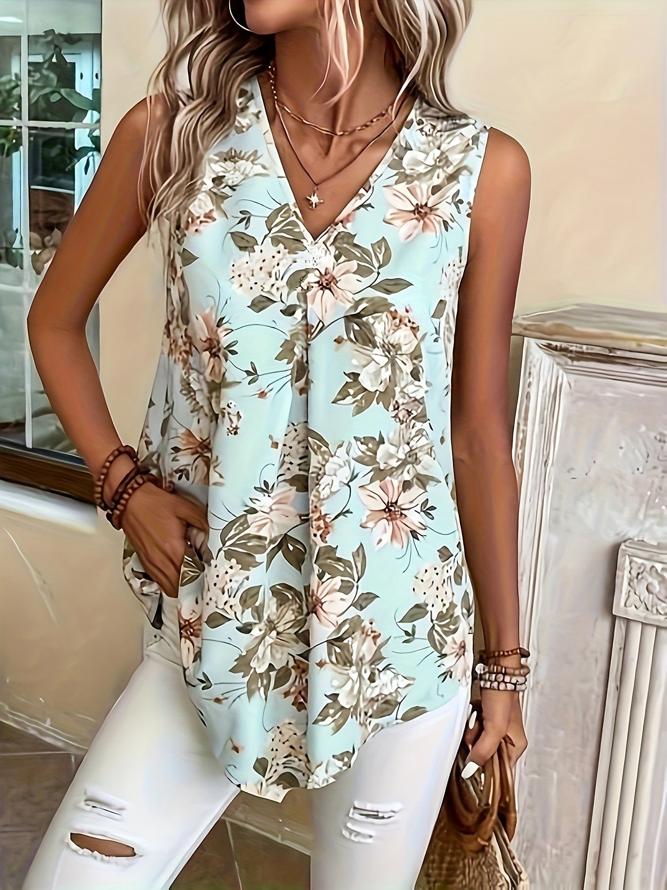 Floral Print V-neck Tank Top, Versatile Sleeveless Loose Vacation Style Top