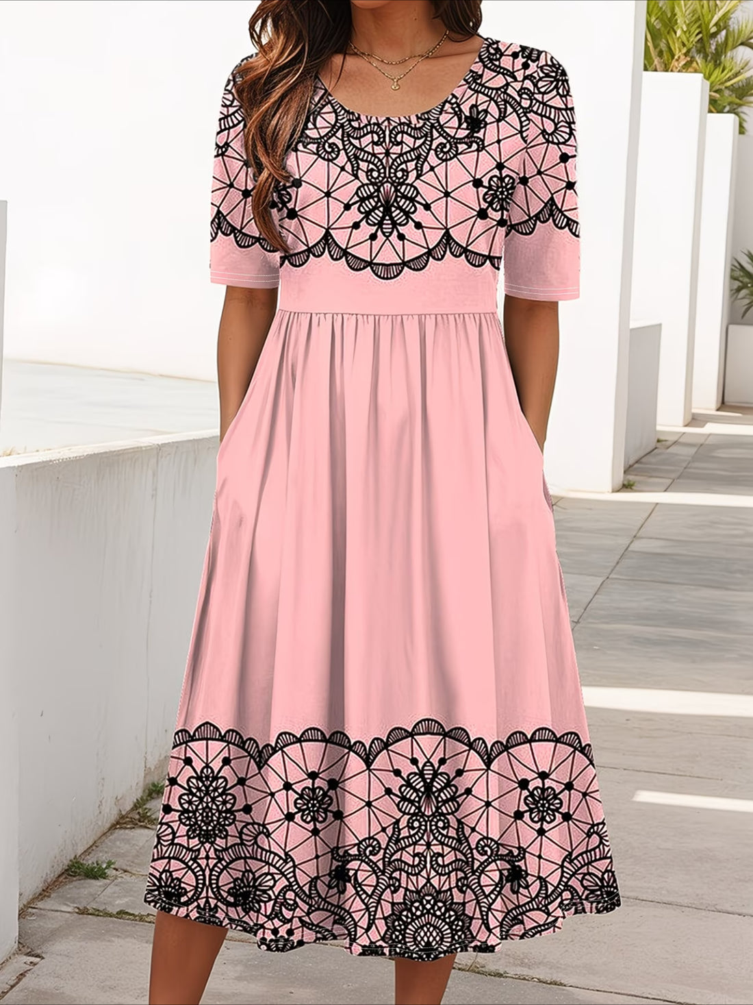 Floral Summer Printing Crew Neck Short Sleeve H-Line Dress