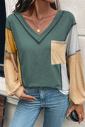 Four Leaf Clover Exposed Stitching Colorblock V Neck Long Sleeve Top