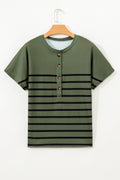 Four Leaf Clover Striped Half Buttons Crew Neck T-Shirt