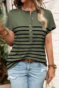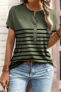 - Classic striped T-shirt with half buttons adds a polished casual touch.Crew neck top offers a clean, timeless look for everyday styling.Soft, breathable fabric keeps this striped tee comfortable all day.Half-button detail elevates a simple striped T-shirt effortlessly.