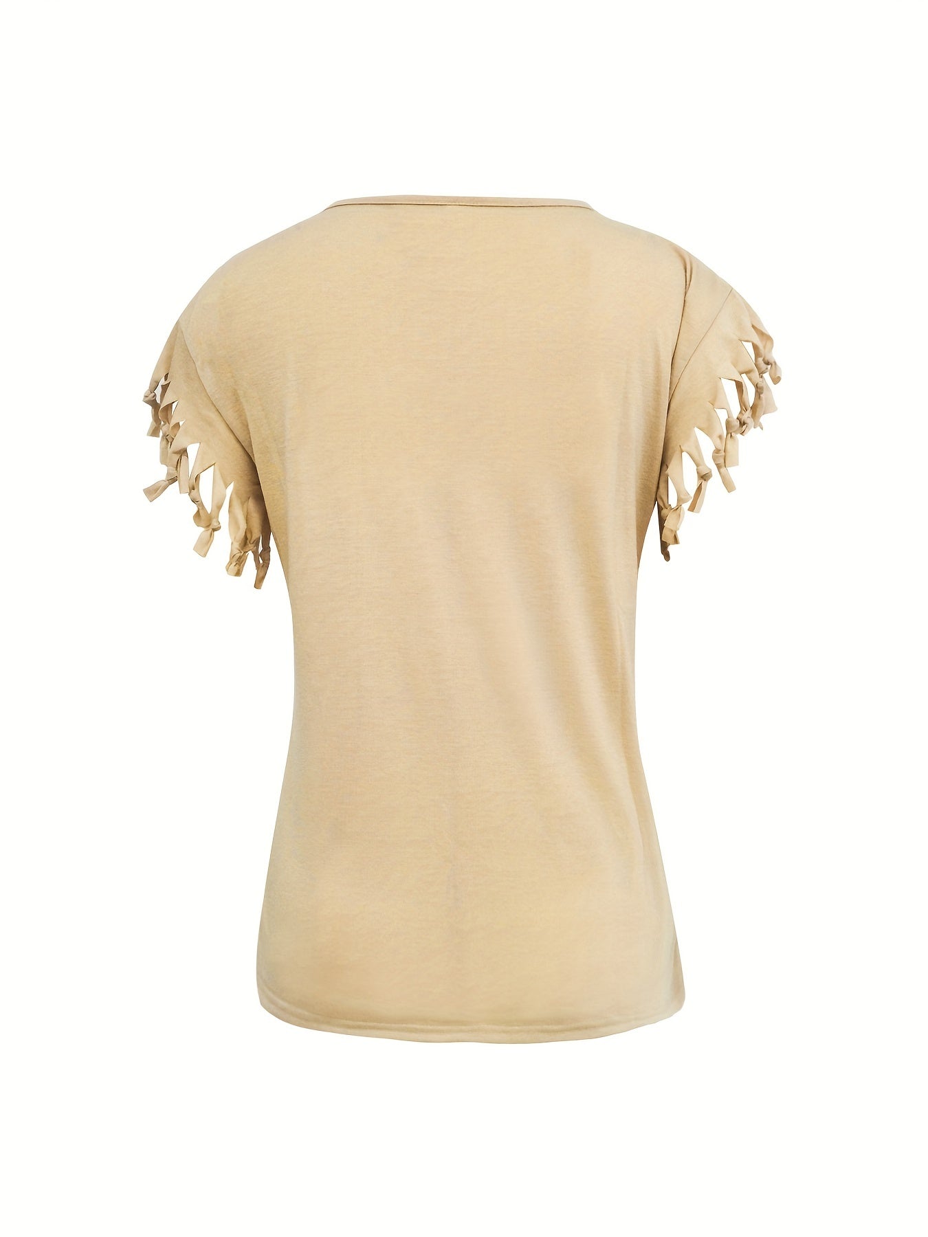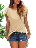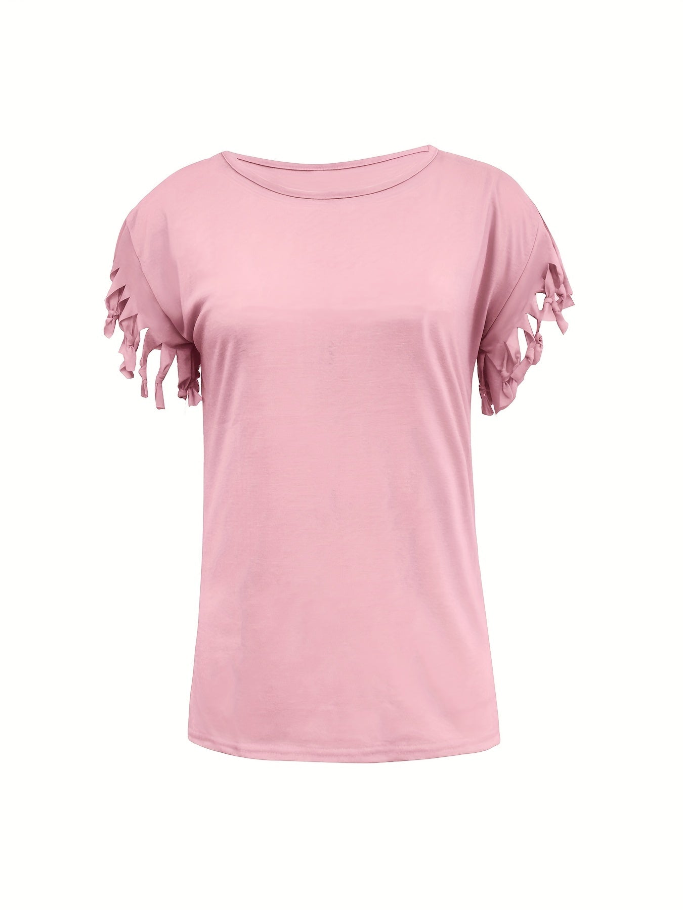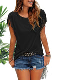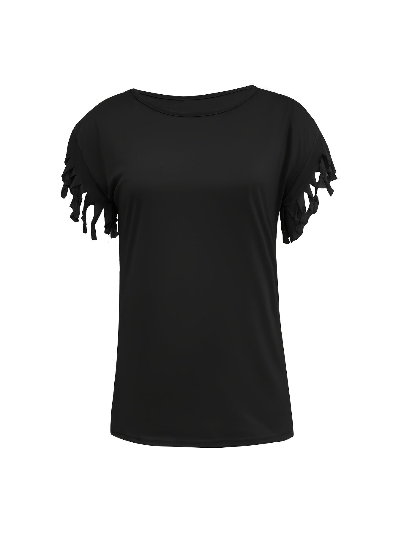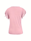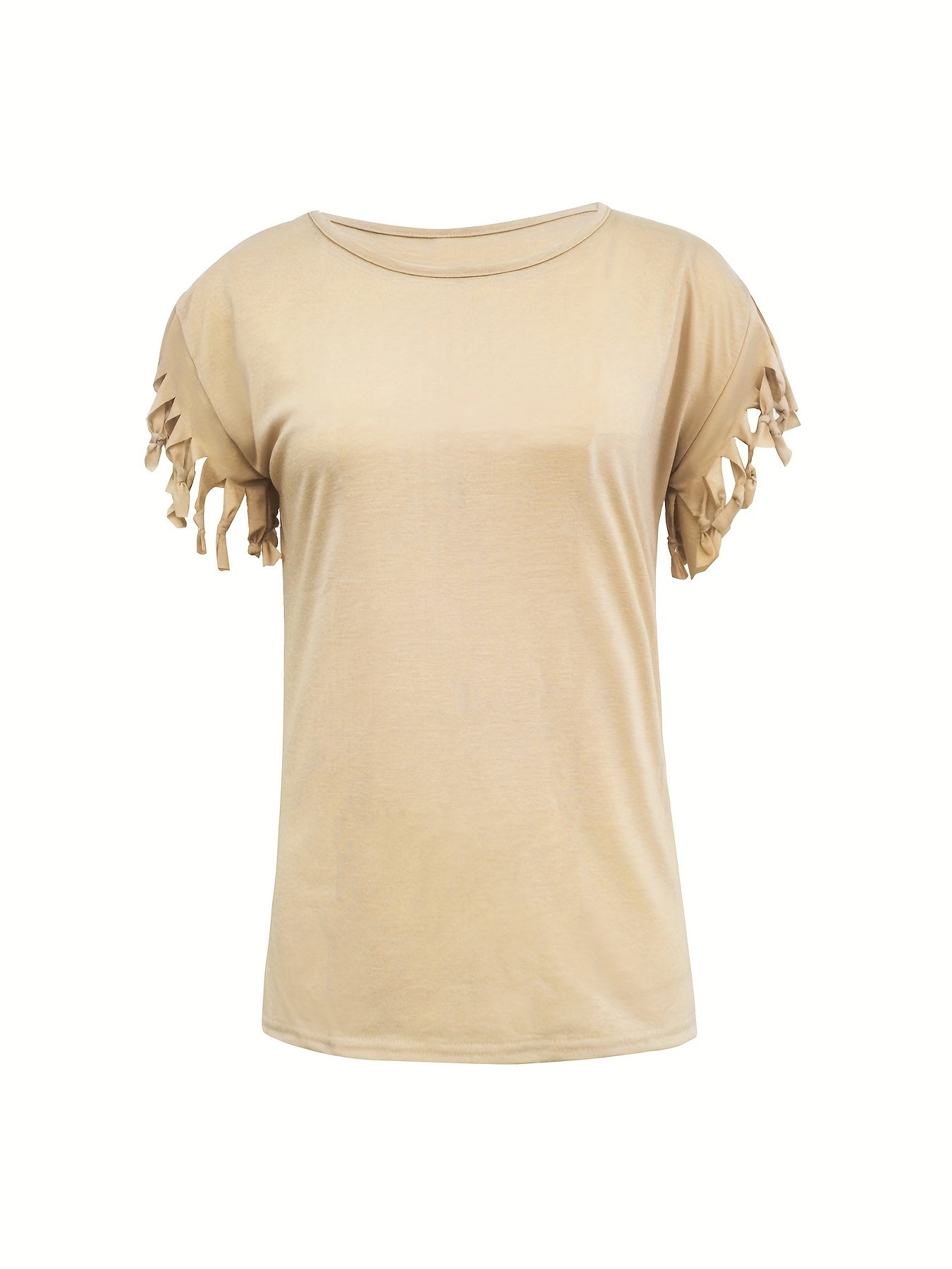 Fringe Hem Solid T-Shirt, Crew Neck Short Sleeve T-Shirt