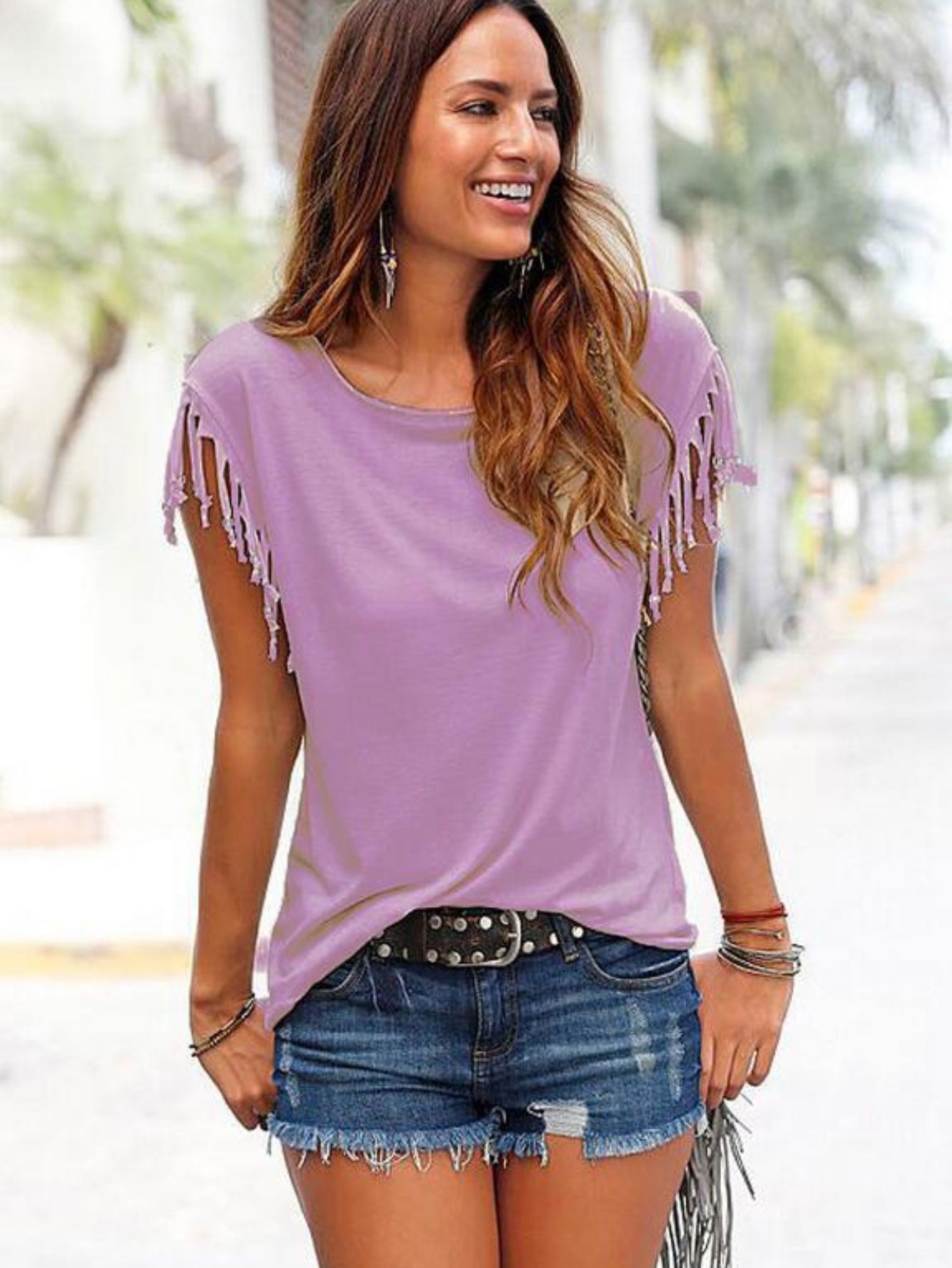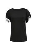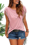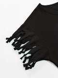 Sale Fringe Hem Solid T-Shirt, Crew Neck Short Sleeve T-Shirt