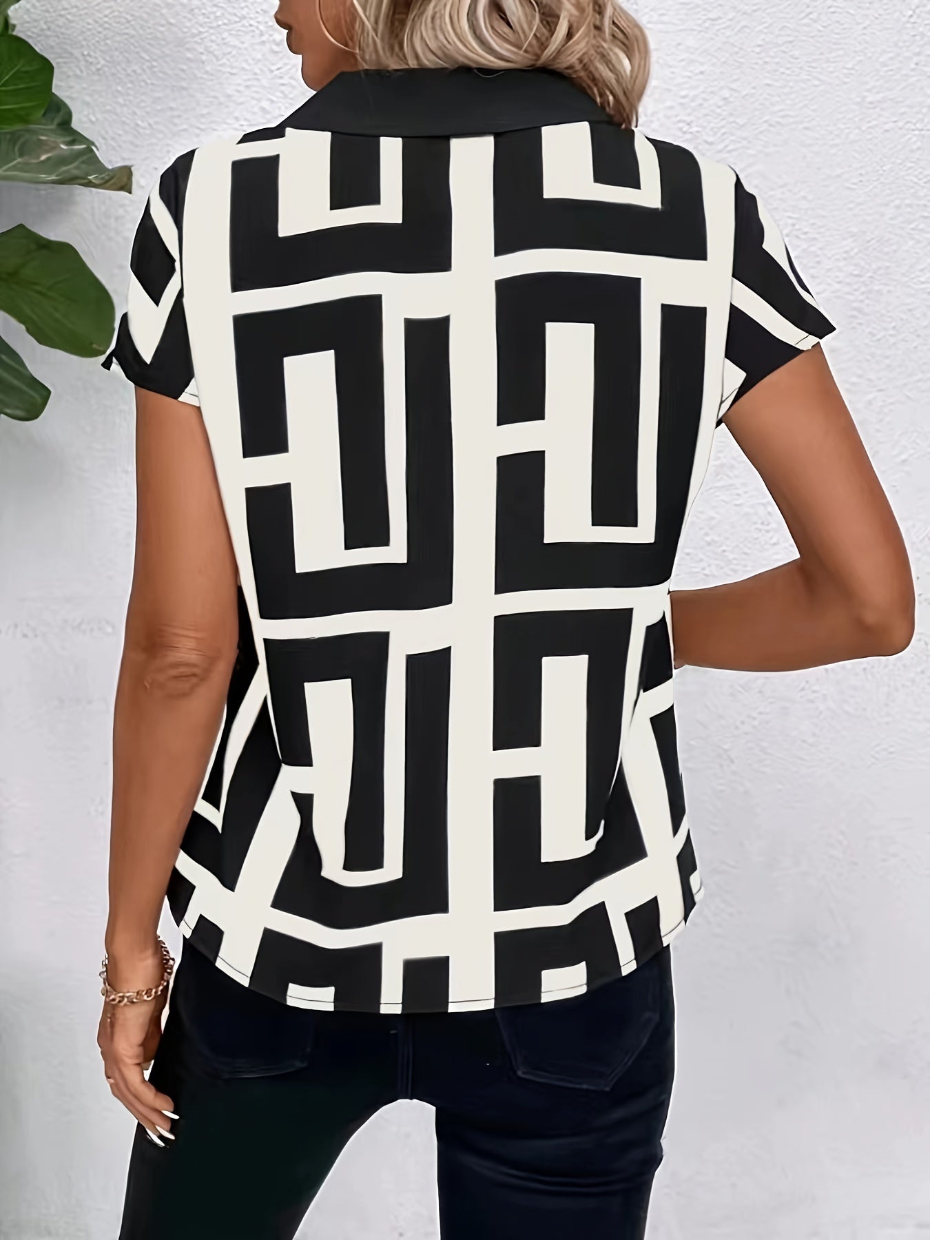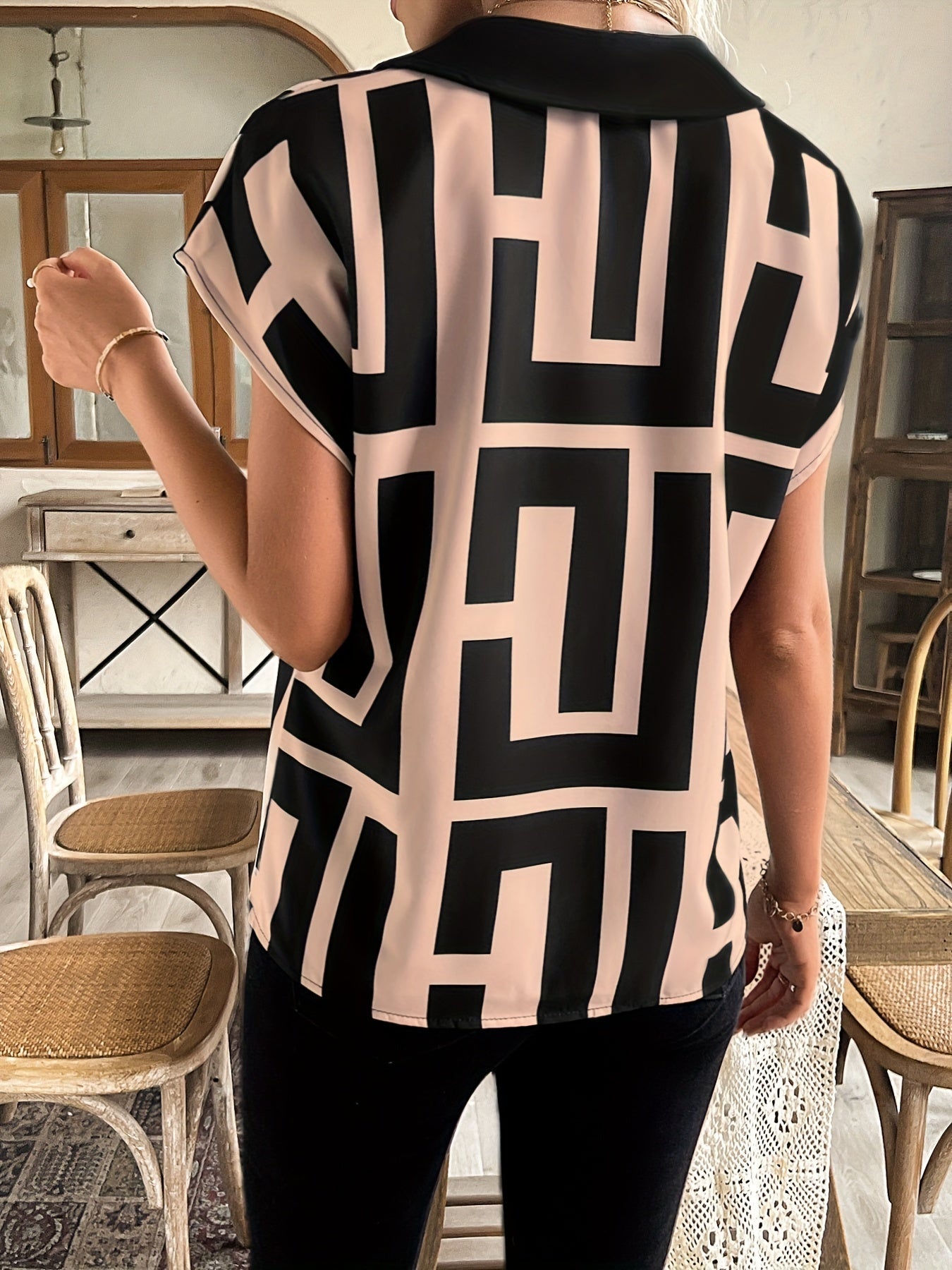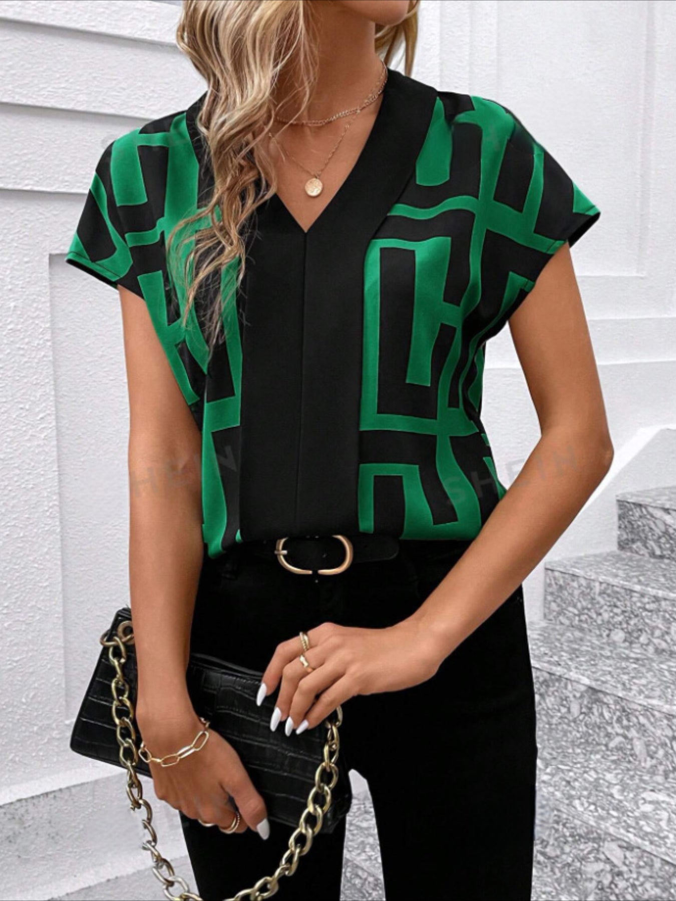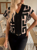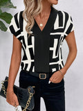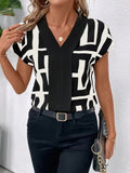 Geo Print V Neck Loose Blouse, YOUNG Short Sleeve Blouse