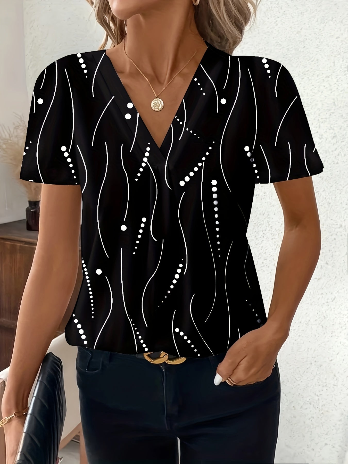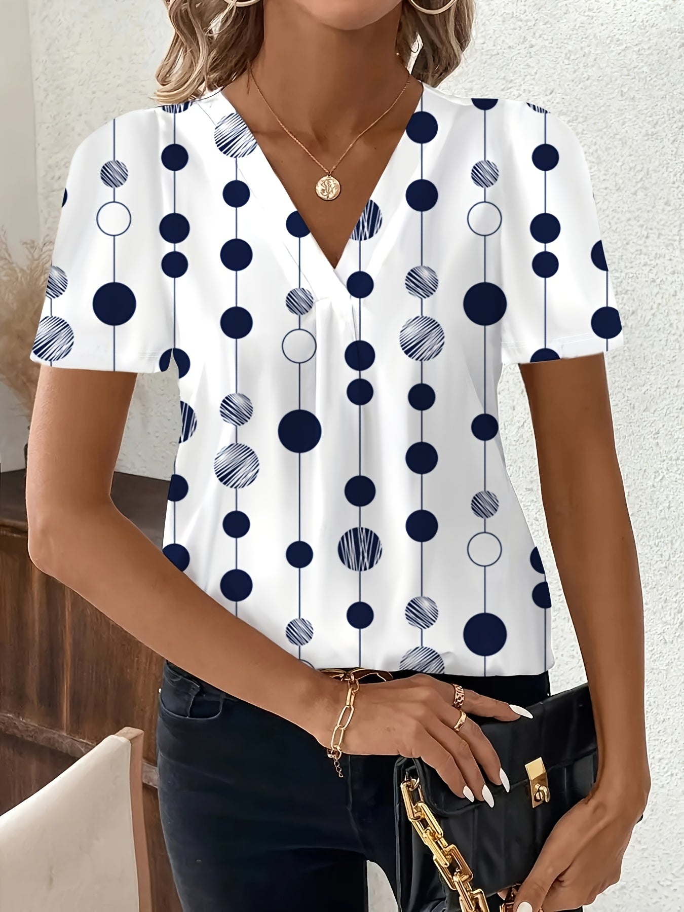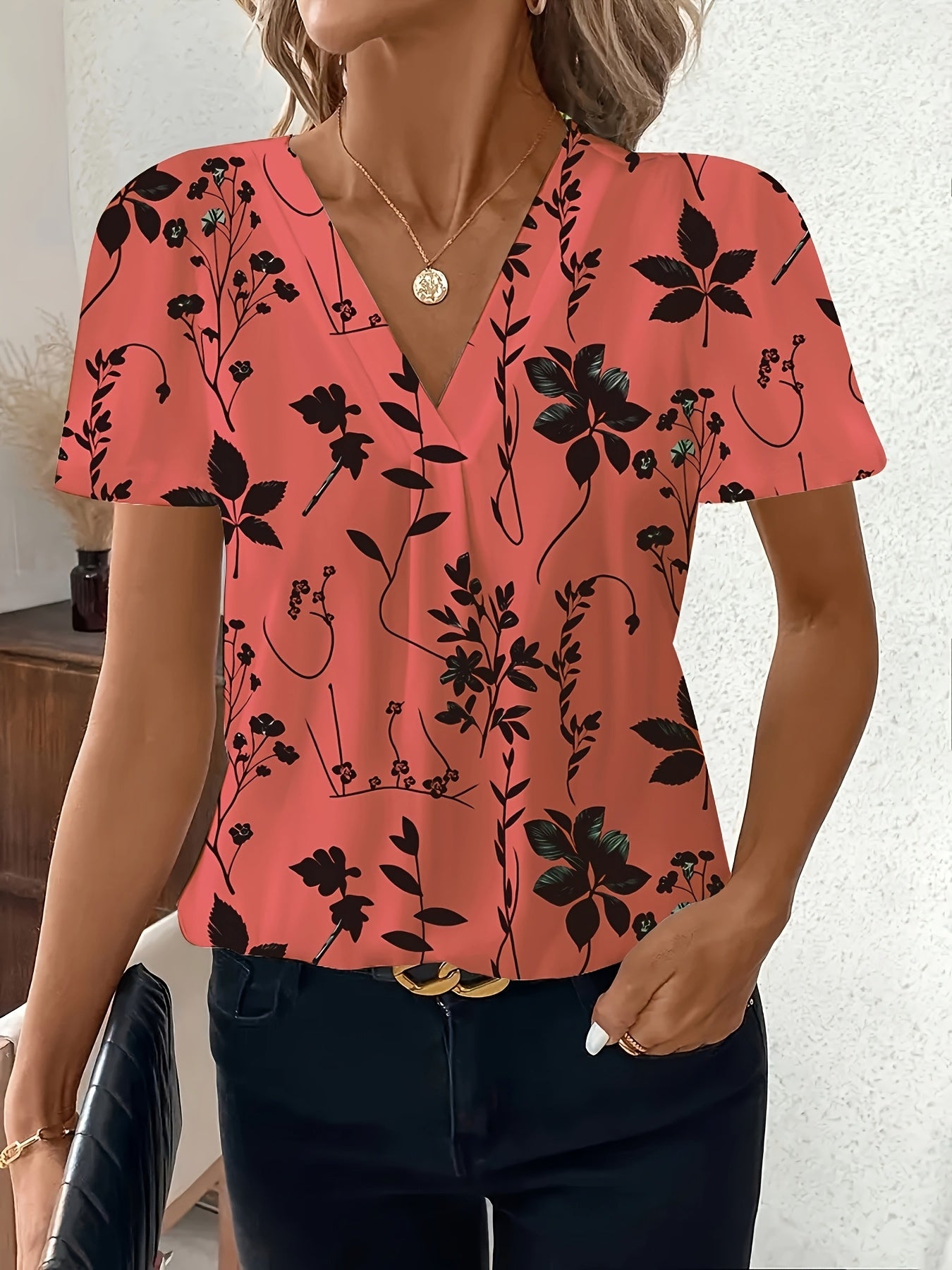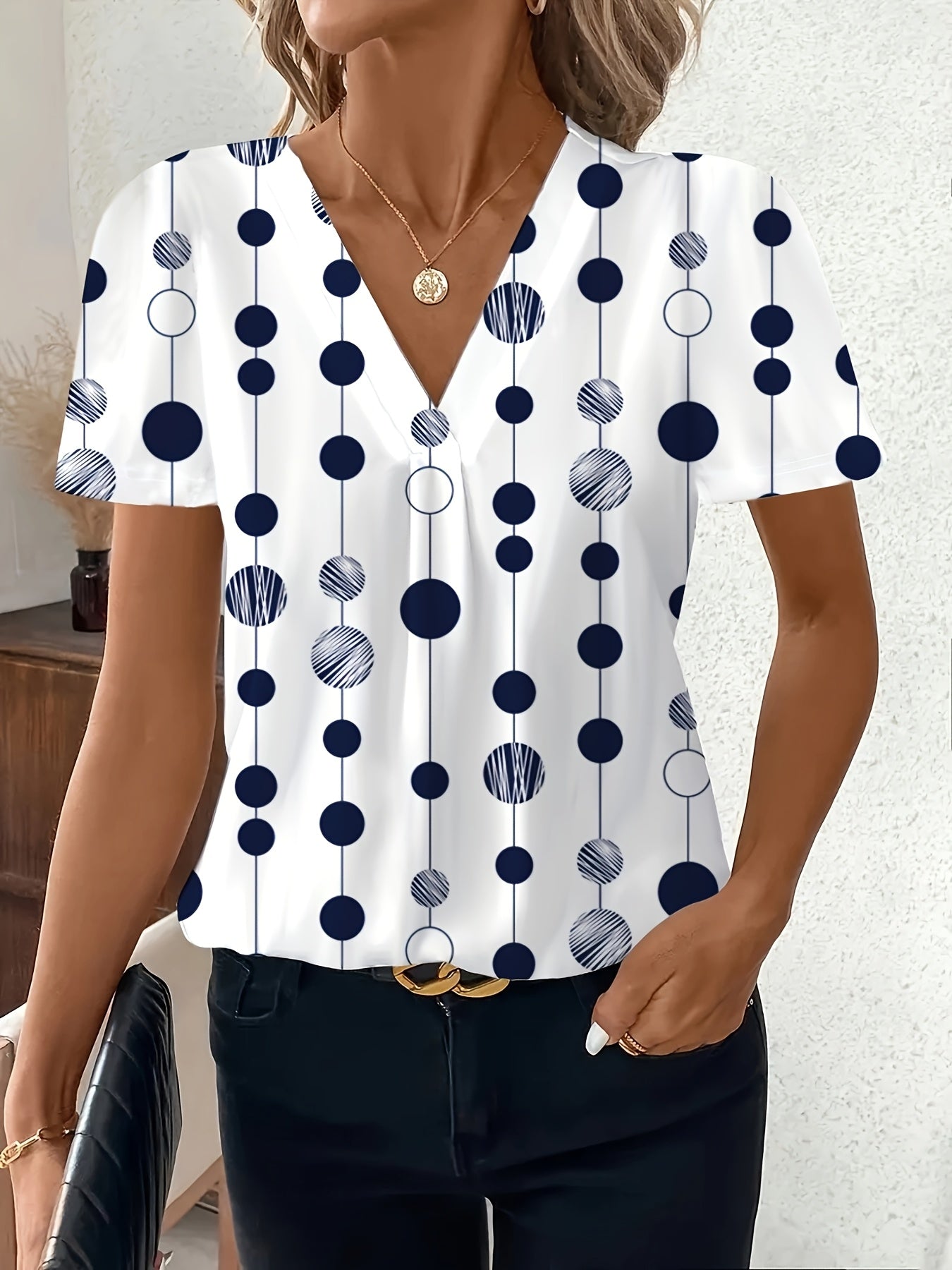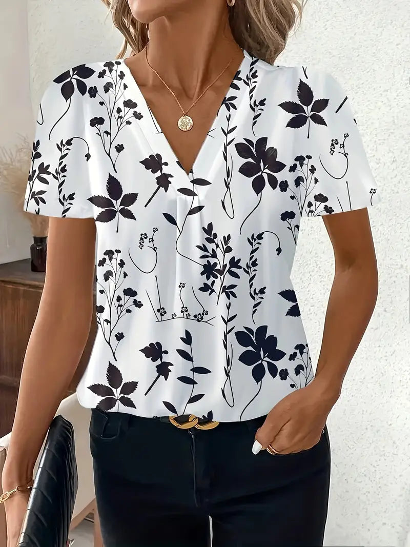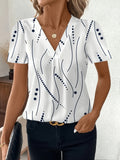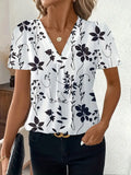 Geometric Flower Pattern Chest Pleats and V-Neck Short Sleeves Shirt