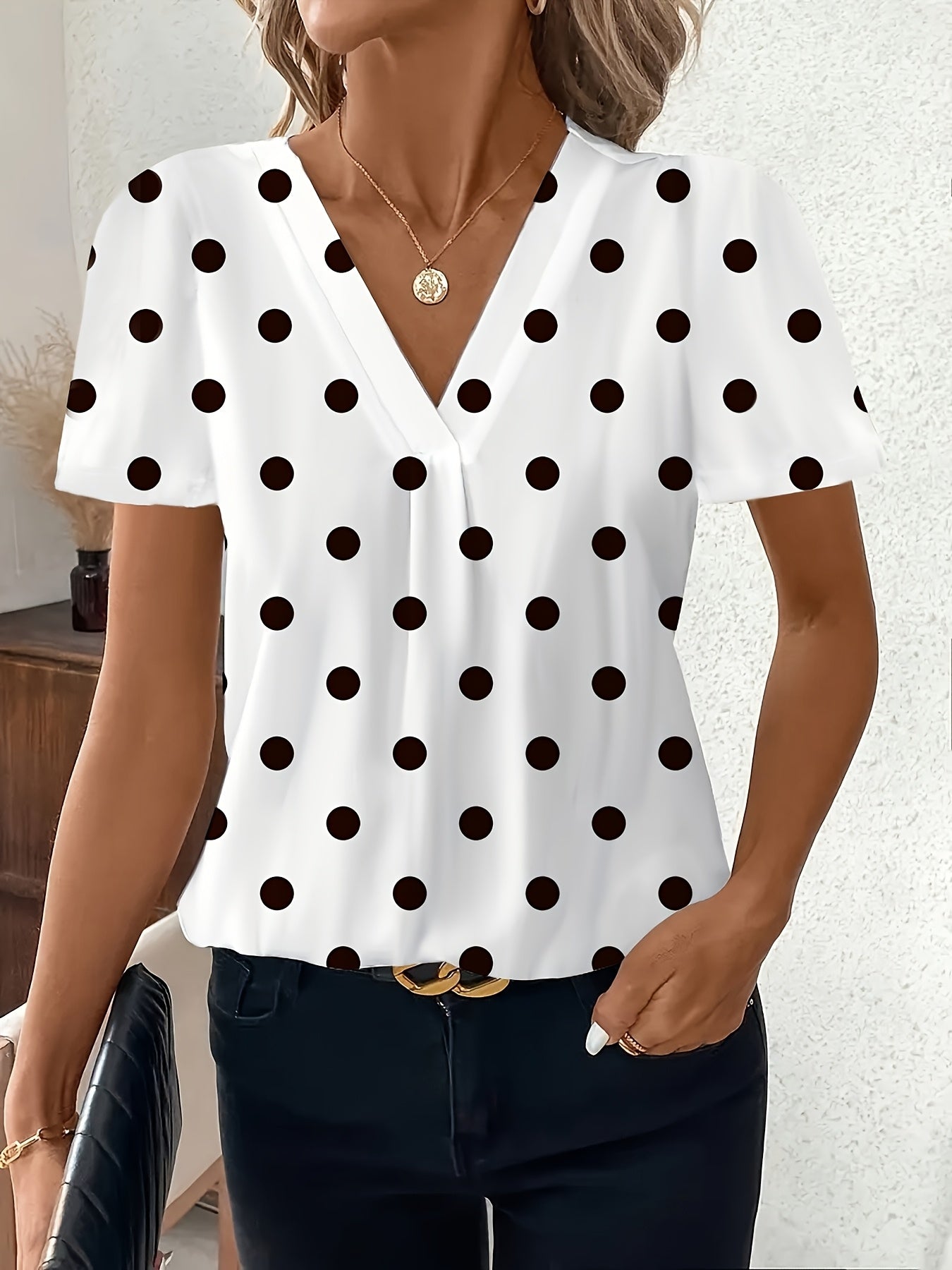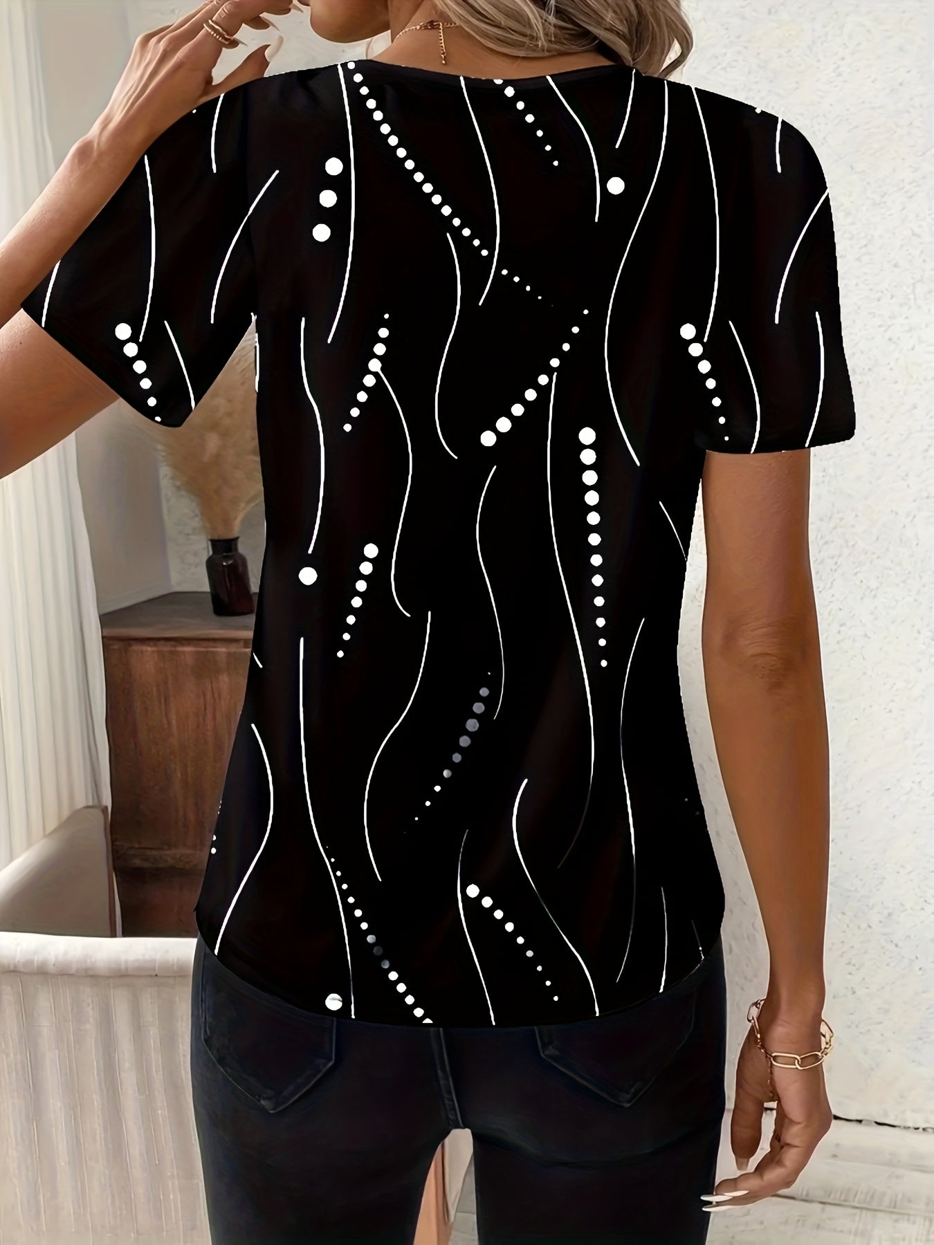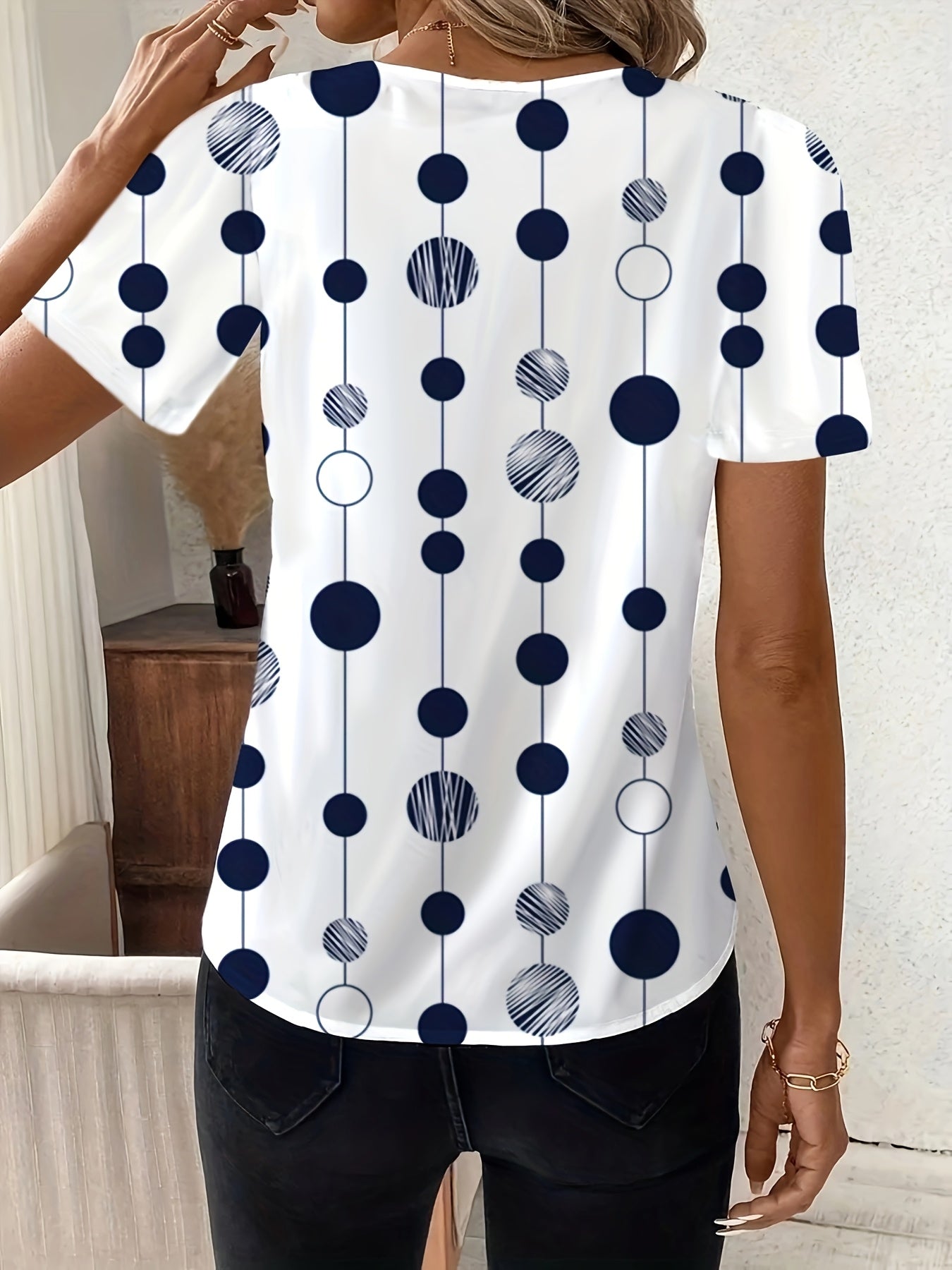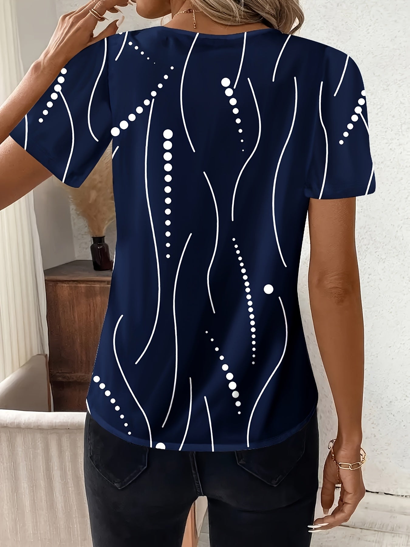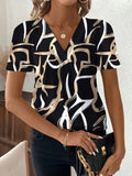 Geometric Flower Pattern Chest Pleats and V-Neck Short Sleeves Shirt