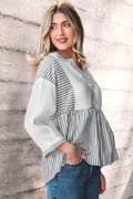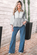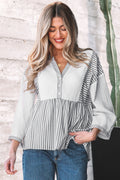 Gray Stripe Half Button Gauze Patchwork Bracelet Sleeve Babydoll Blouse