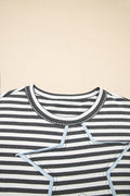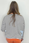Gray Stripe Starry Patch Drop Shoulder Raw Edge Casual Knit Top