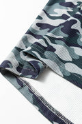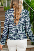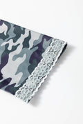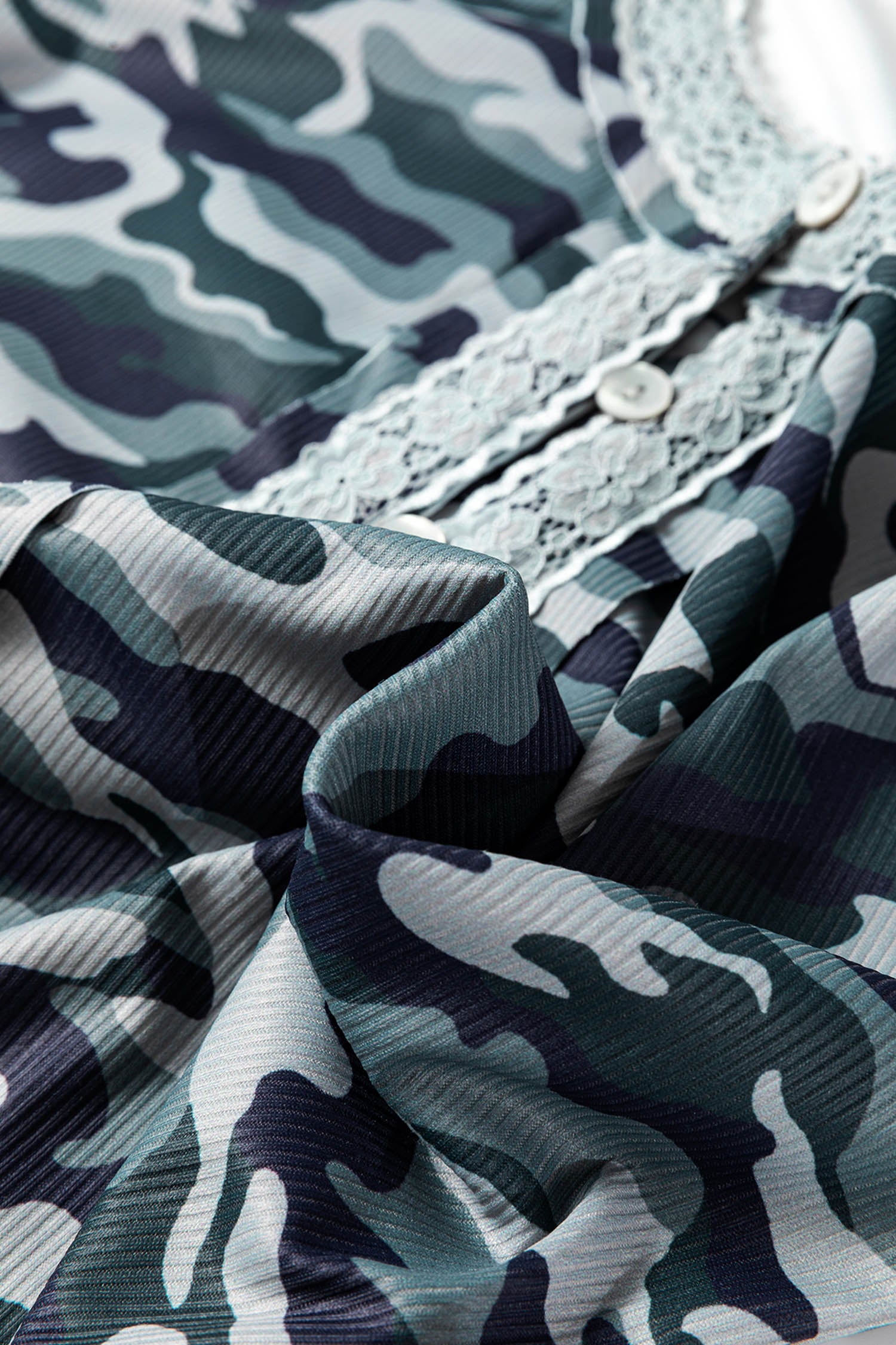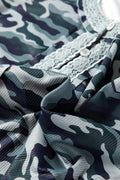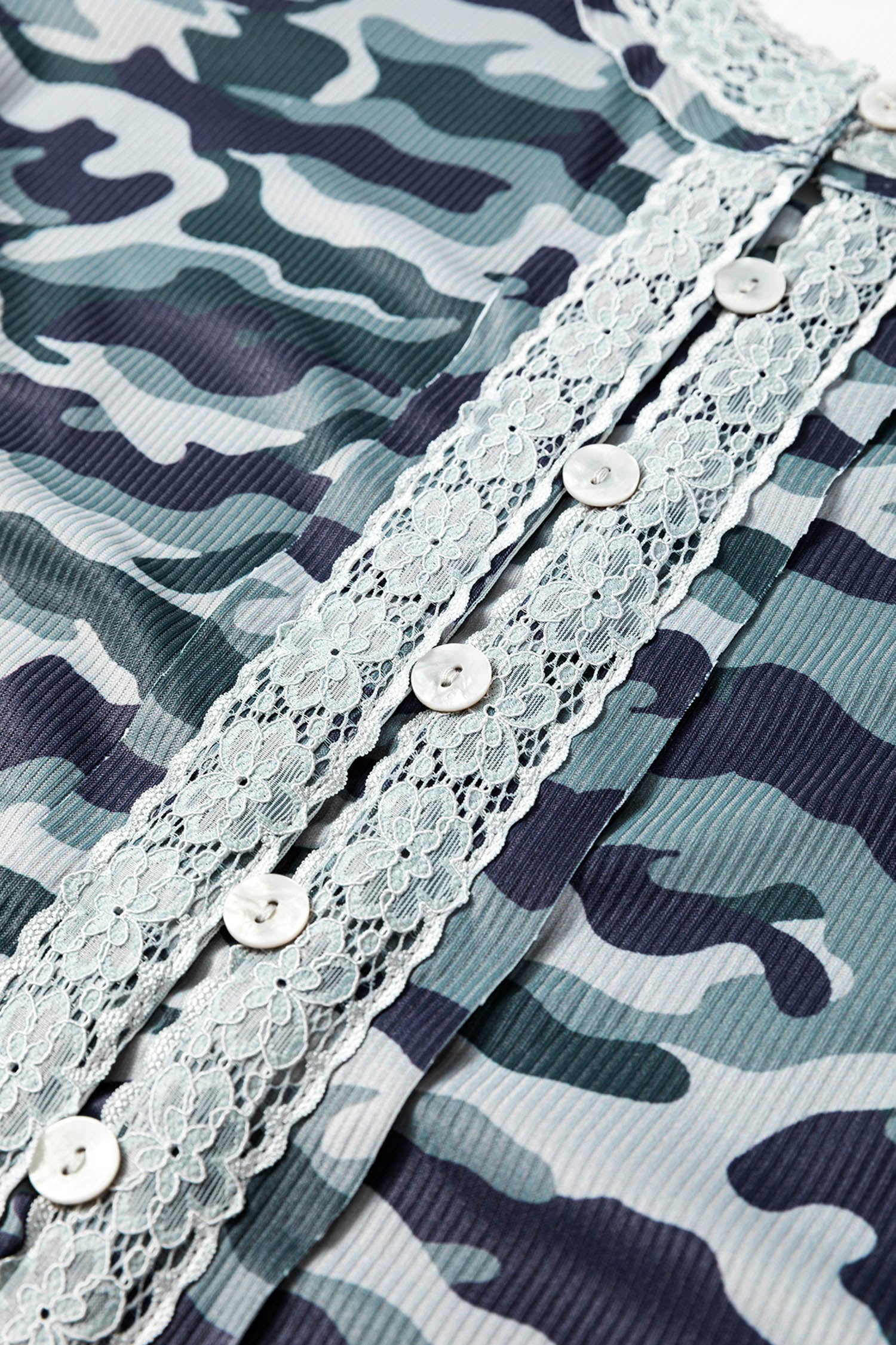 Green Camouflage Print Lace Patchwork Detail Button Long Sleeve Top