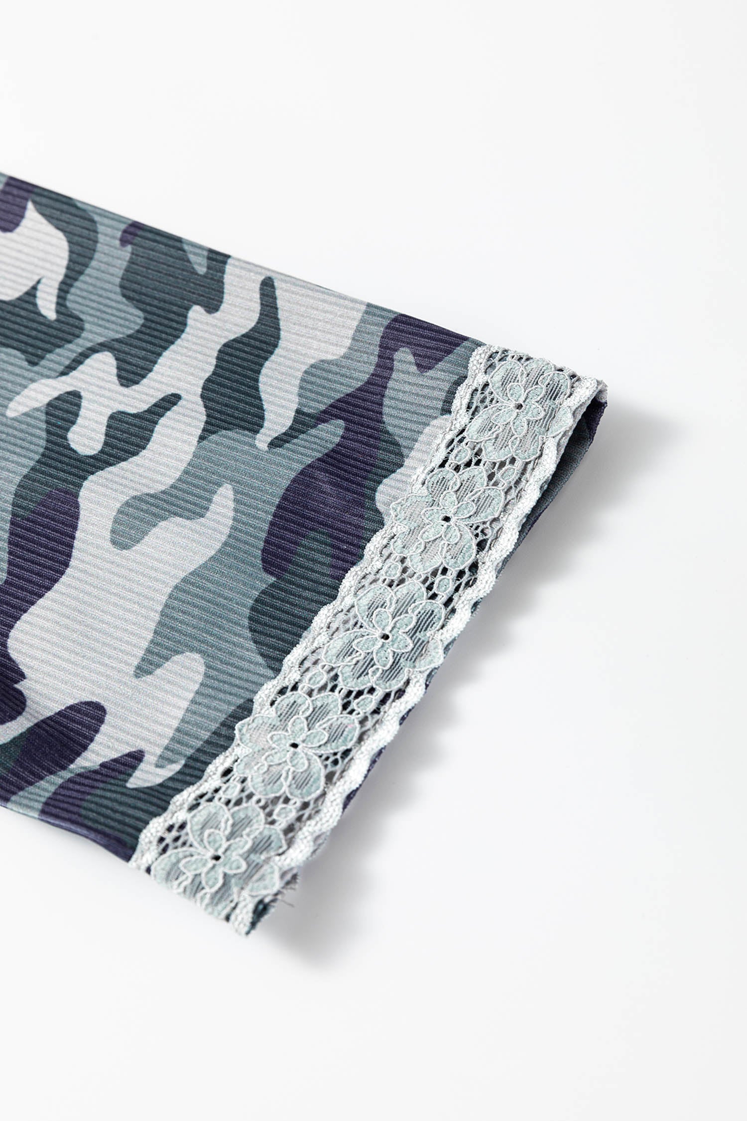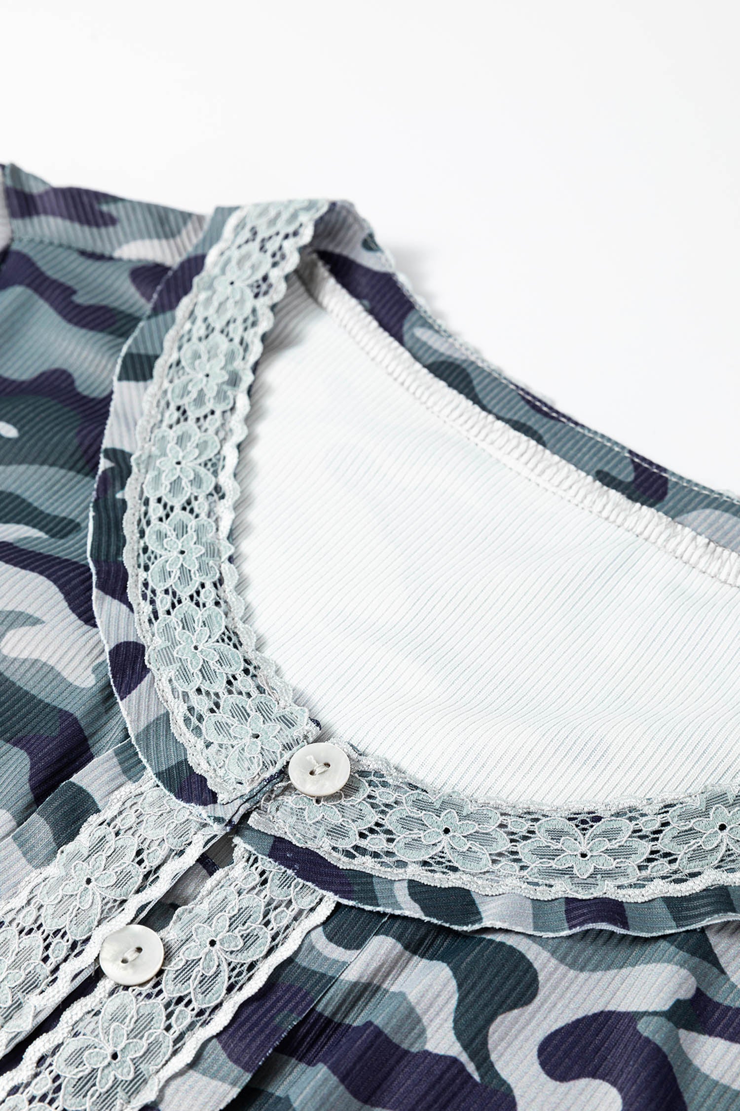 - Get a fresh twist on camo with this long sleeve top.Featuring a delicate lace patchwork trimming design.This loose long sleeve top has a button front design.Pair it with jeans for an effortless daily fashion look.