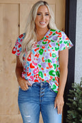 Sale Green Contrast Leopard Print V Neck Short Sleeve Blouse