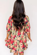 Green Floral Print Frilled Collar V Neck Half Sleeve Mini Dress
