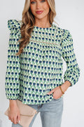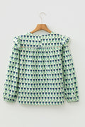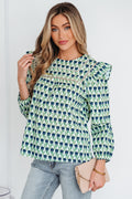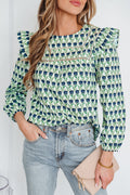 Green Floral Print Lace Detail Ruffle Trim Long Sleeve Blouse