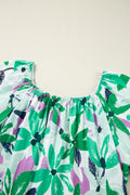 Green Floral Print Shirred Square Neck Loose Fit Mini Dress