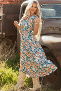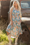 Sale Green Floral Print Trimmed V Neck Tie Waist Sleeveless Holiday Long Dress
