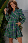 Green Plaid Print Frilly Collar Long Sleeve Shift Mini Dress
