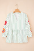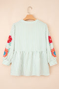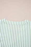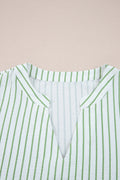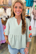 Sale Green Stripe Flower Puff Sleeve Notched V Neck Babydoll Blouse