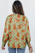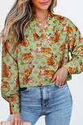 Green Tiger Floral Printed Collared V Neck Casual Shirt